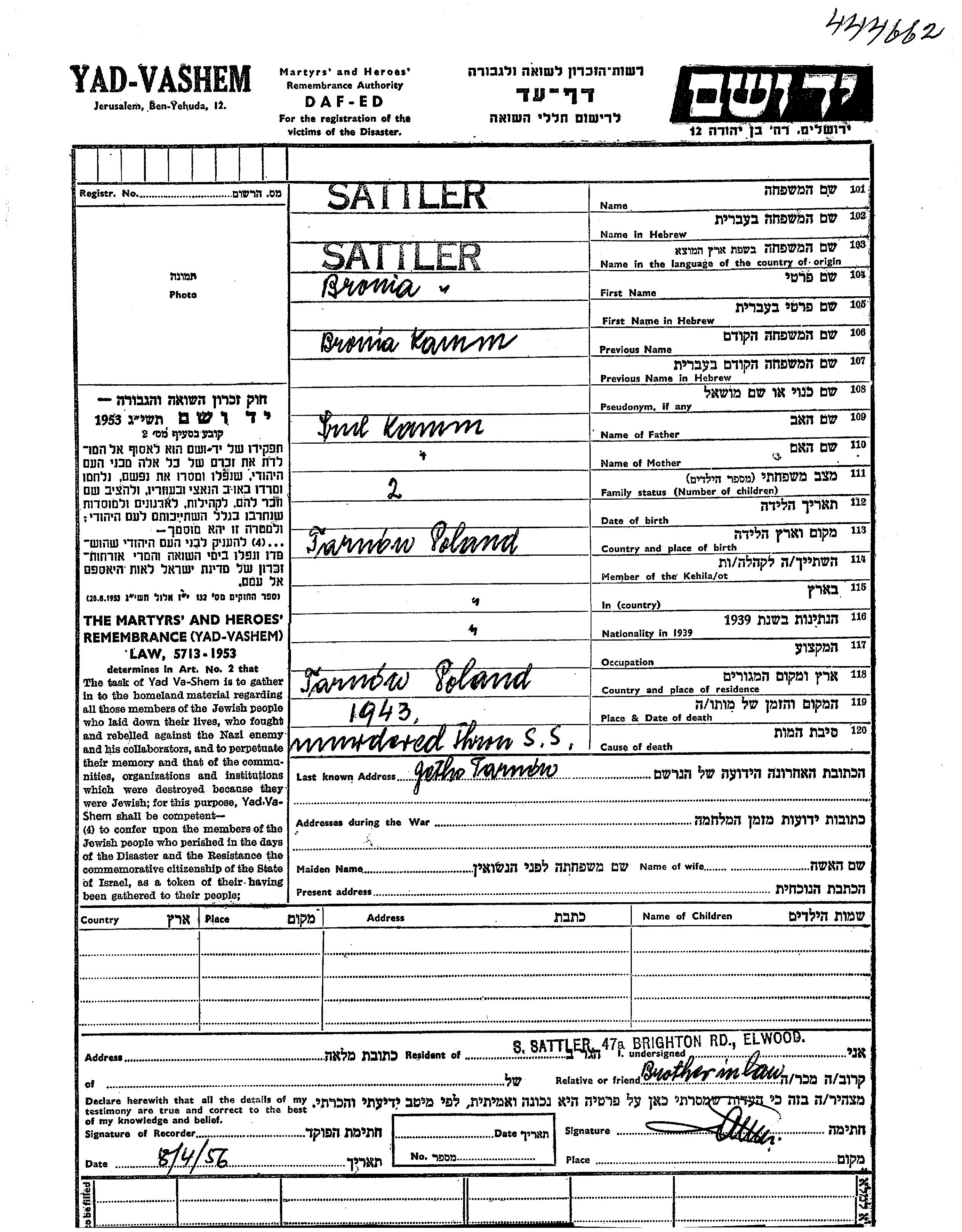 Sattler Bronia Tarnow, Poland Page of Testimony