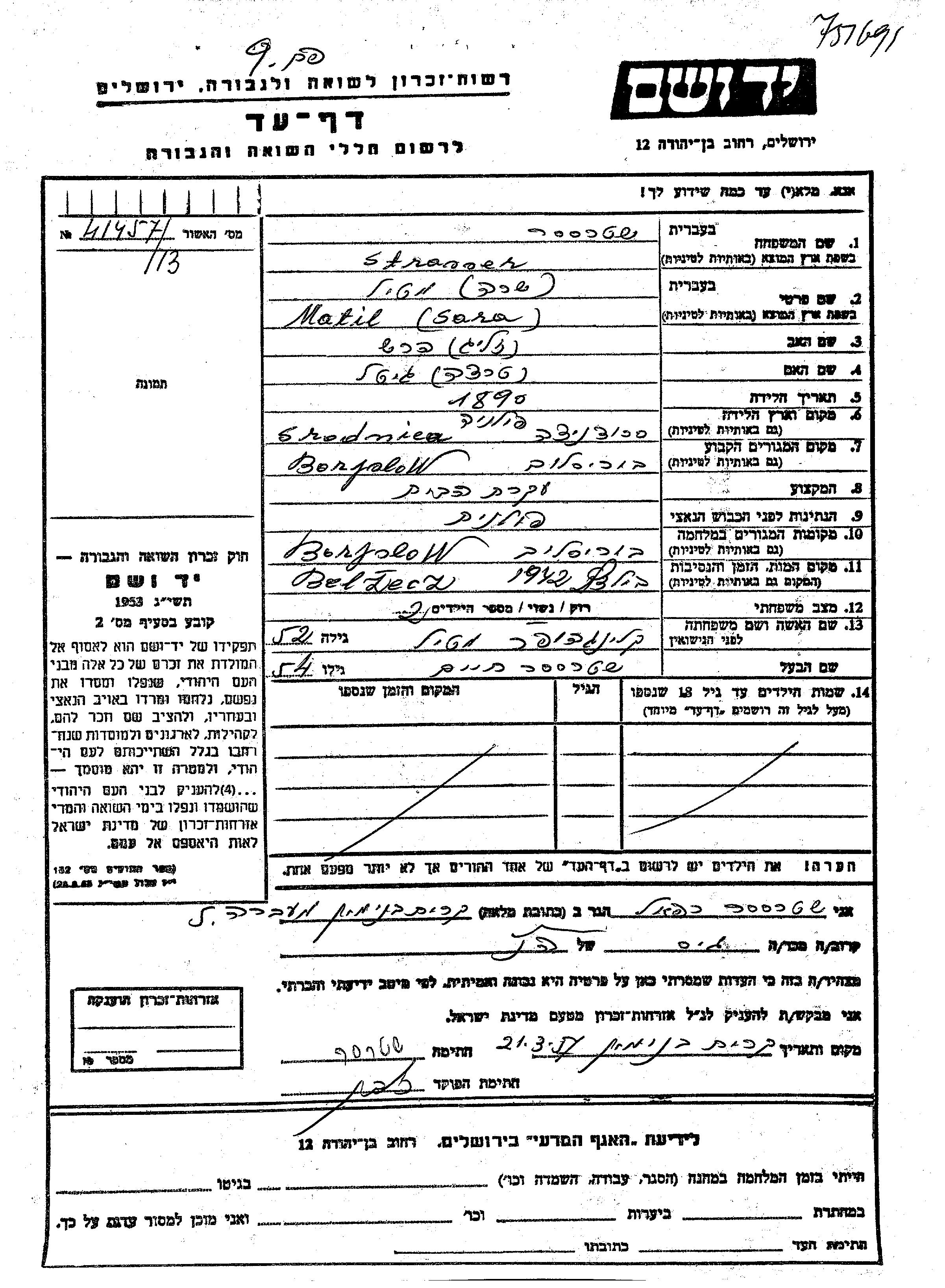 Matil Sara Strasser nee Klinghofer was born in Serednica, Poland, 1890 to Hersh Zelig and Gitel Tertza. She was a housewife and married to Khaim. Prior to WWII she lived in Boryslaw, Poland. During the war she was in Boryslaw, Poland. Matil Sara was murdered in the Shoah. Place of death: Belzec, Poland, 1942.