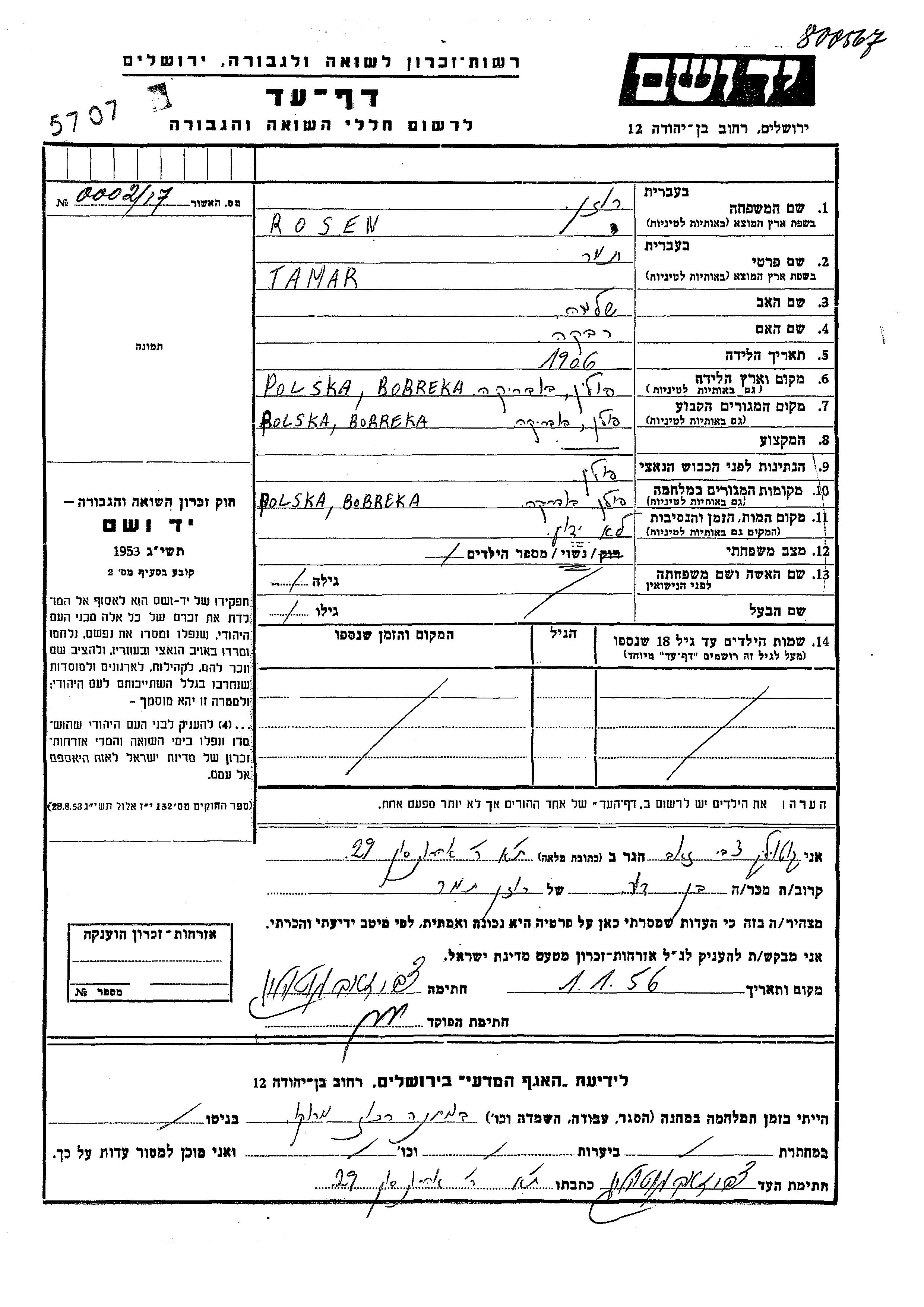 Tamar Rosen was born in Bobrek, Poland, 1906 to Shlomo and Rivka. She was married. Prior to WWII she lived in Bobrek, Poland. During the war she was in Bobrek, Poland. Tamar was murdered in the Shoah.