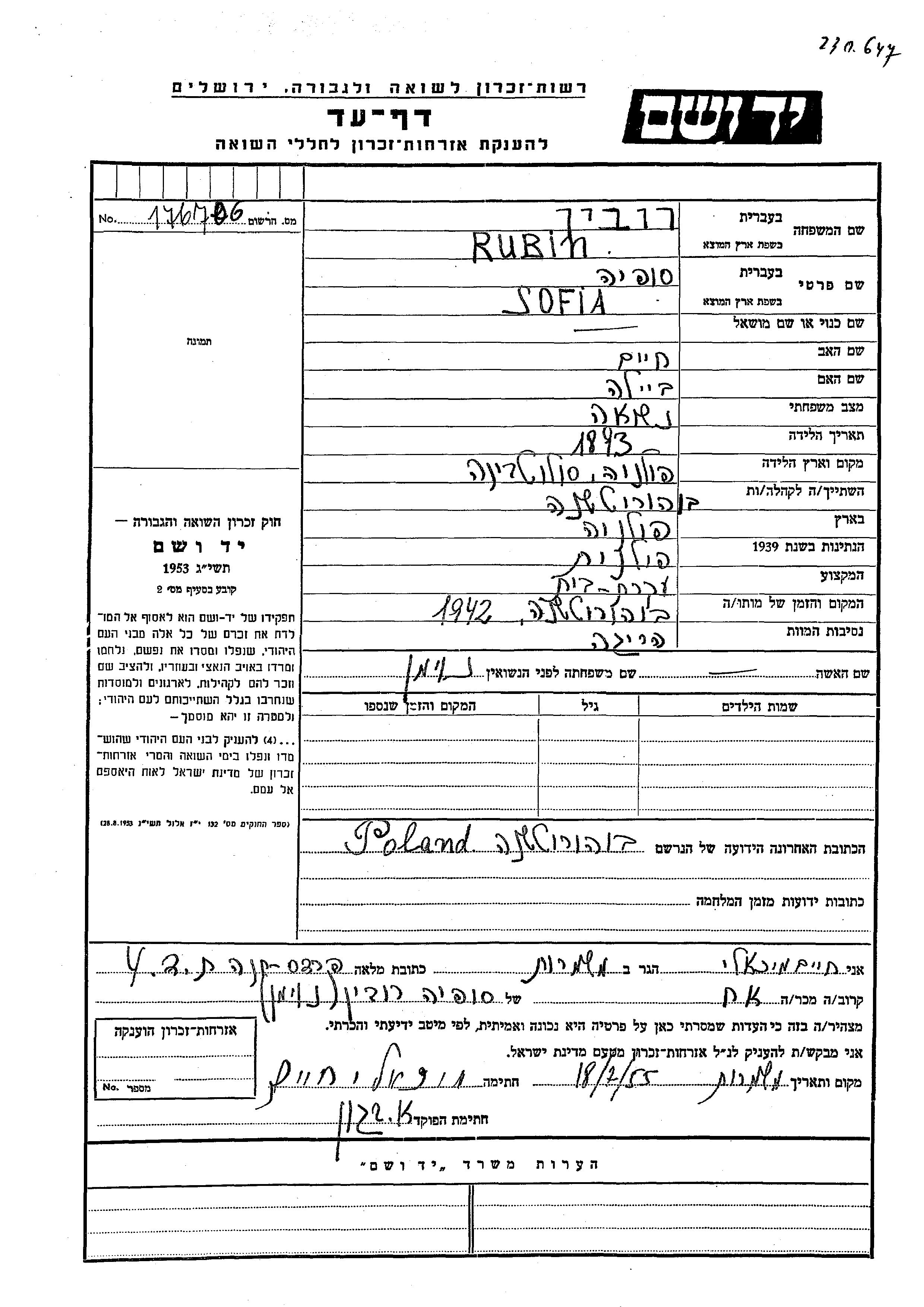 Rubin Sofia 1893 Bohoroczyn, Poland Page of Testimony