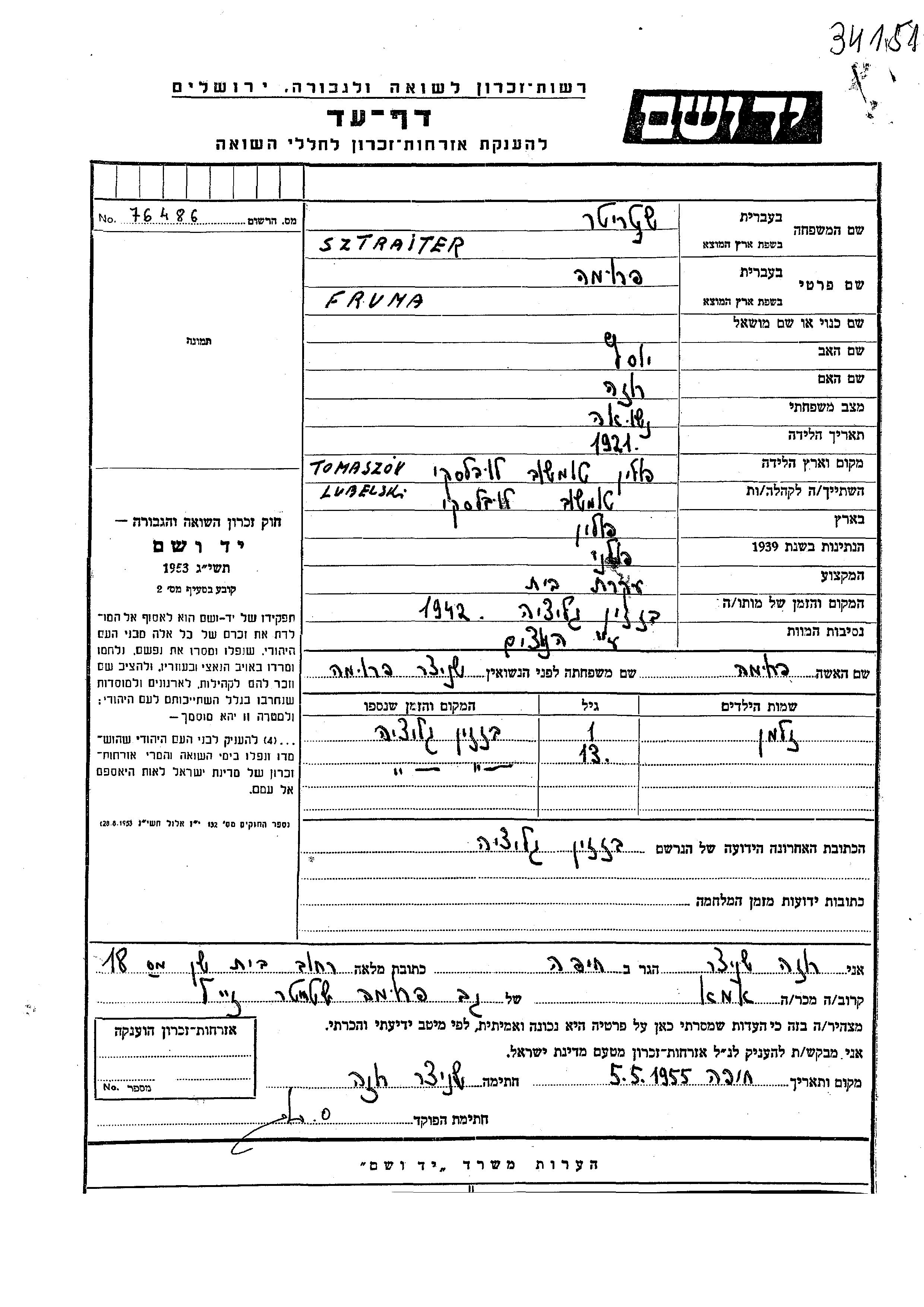 Sztraiter Fruma 1921 Tomaszow Lubelski, Poland Page of Testimony