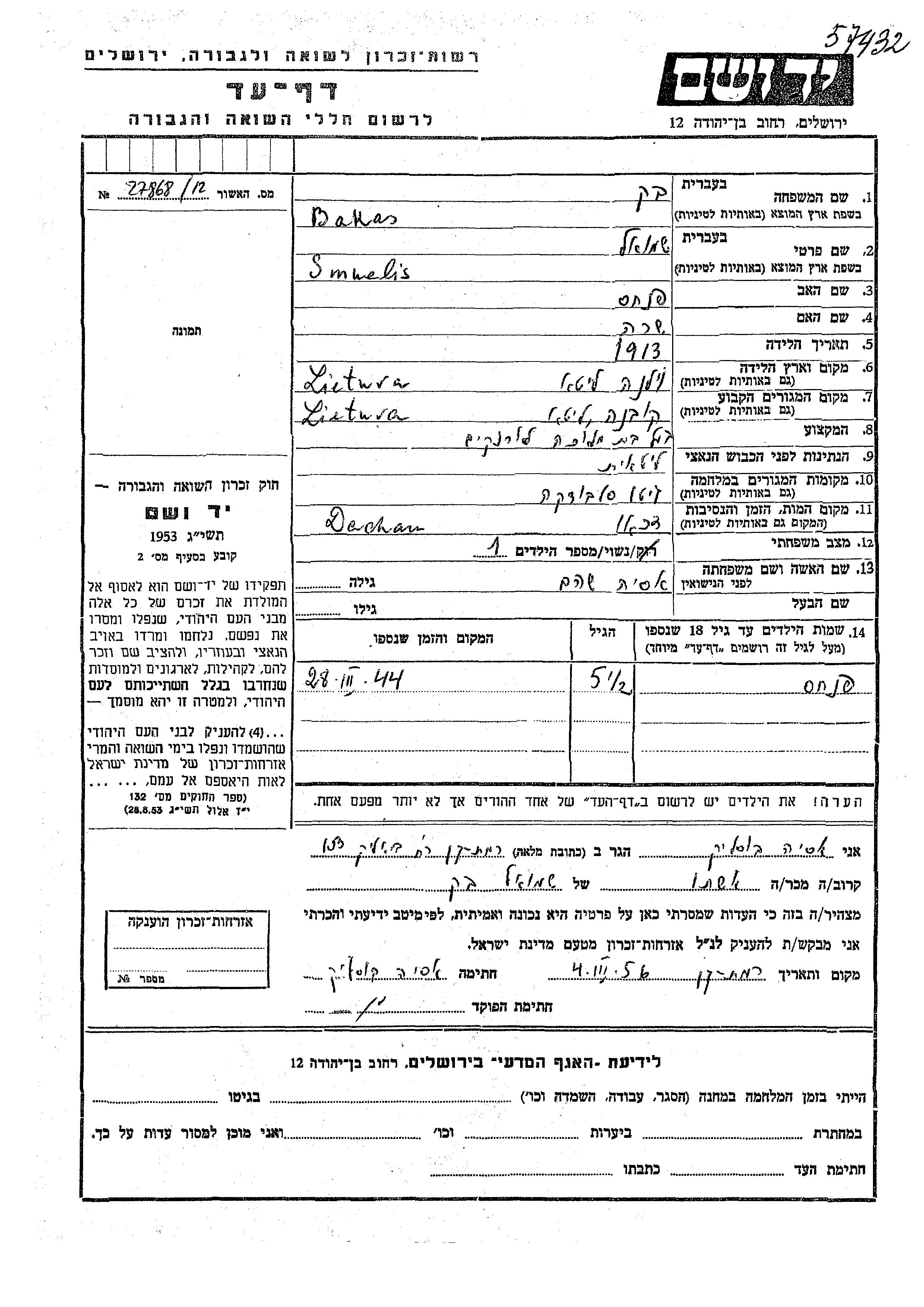Bakas Pinchas 1938 Kovno, Lithuania Page of Testimony