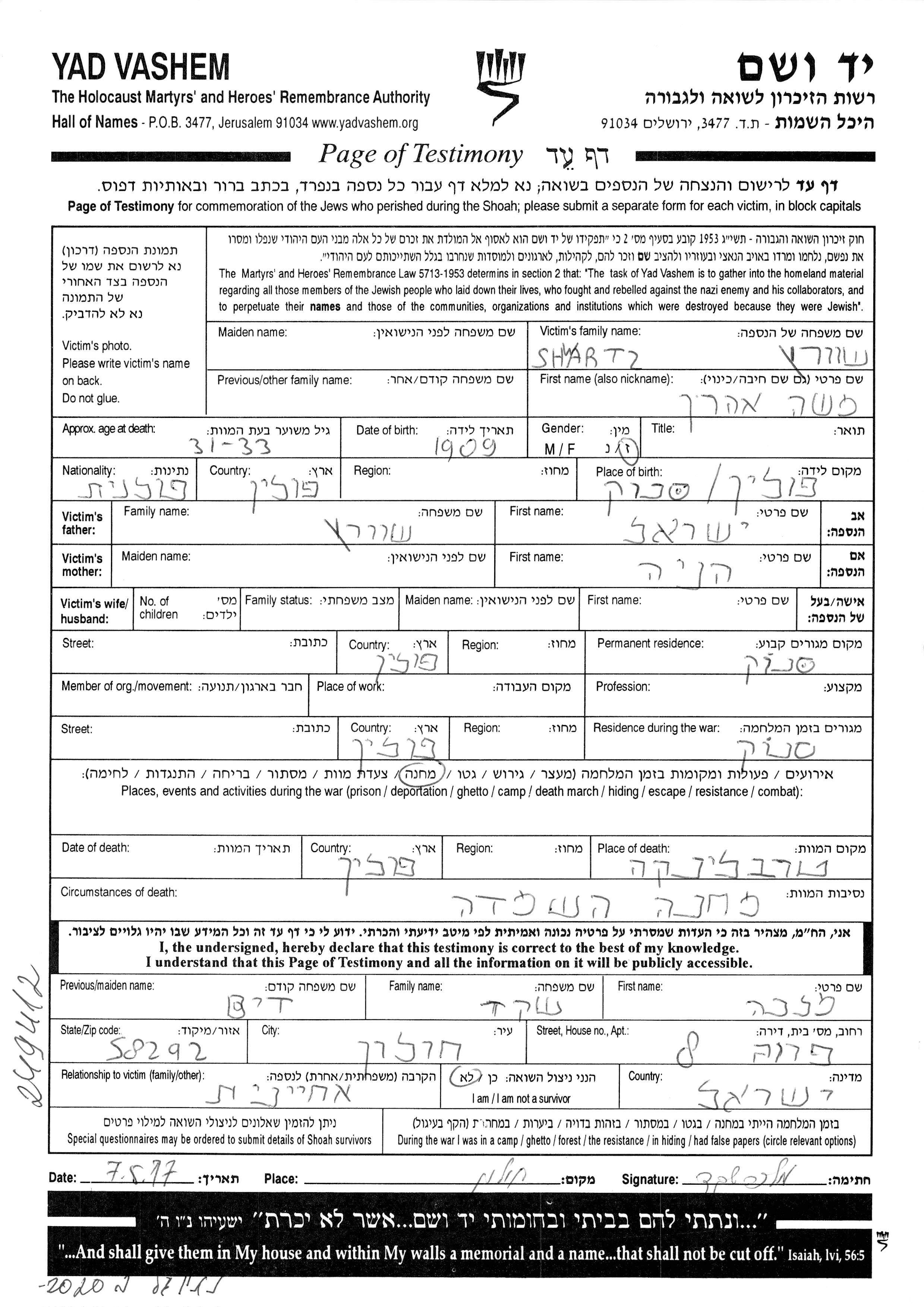 Moshe Aharon Shwartz was born in Sanok, Poland to Yisrael and Henia. Prior to WWII he lived in Sanok, Poland. During the war he was in Sanok, Poland. Moshe Aharon was murdered in the Shoah. Place of death: Treblinka, Poland.