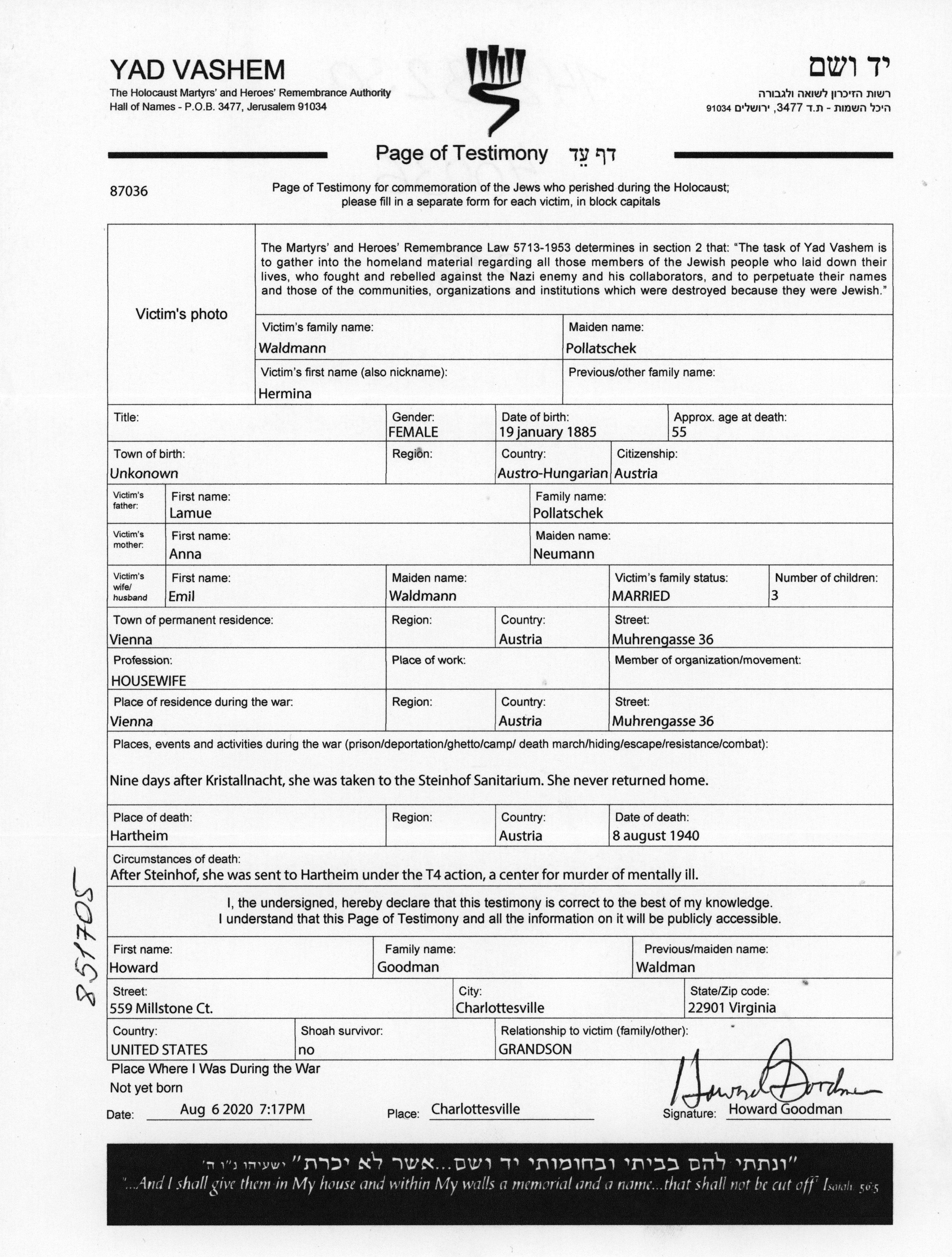 Hermina Waldmann nee Pollatschek was born, 1885. She was a housewife. Prior to WWII she lived in Vienna, Austria. Hermina was murdered in the Shoah. Place of death: unstated place, 08/08/1940.