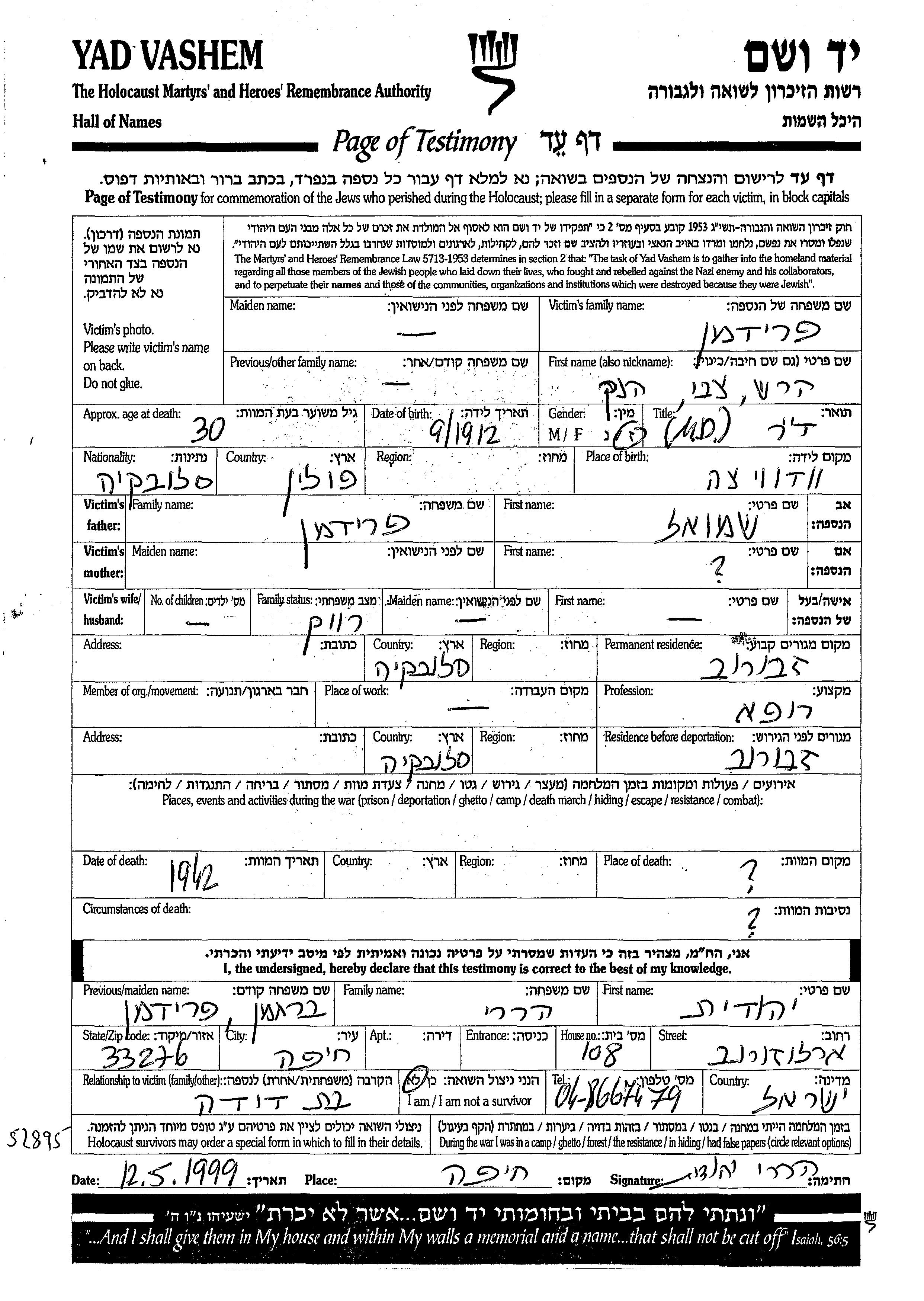Hersh Tzvi Friedmann was born in Krakow, Poland, 1912. He was a physician. Prior to WWII he lived in Zborow, Poland. Hersh Tzvi was murdered in the Shoah. Place of death: Auschwitz, Poland, 1942.