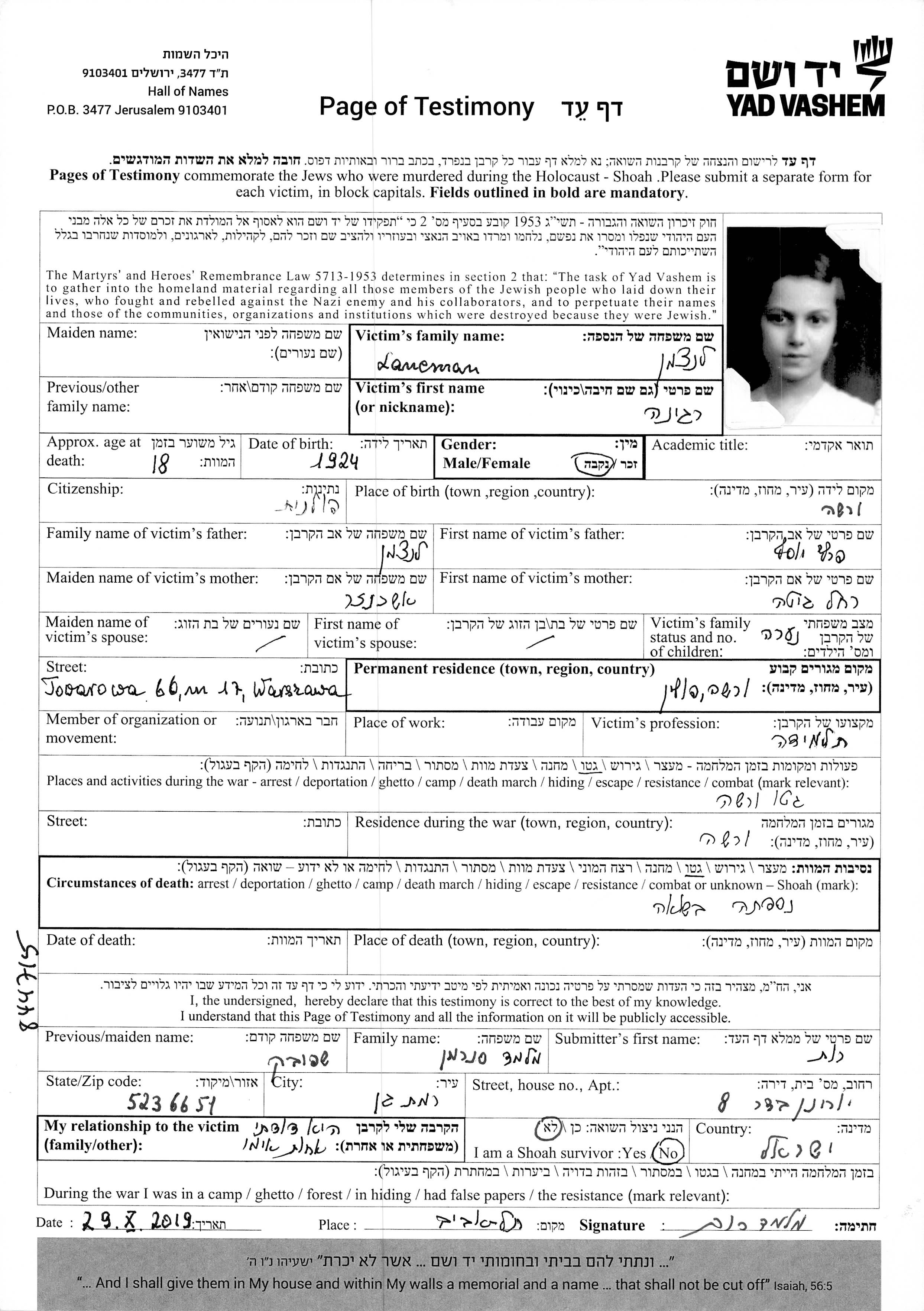 Lantzman | Regina Rivka | 1925 | Warsaw, Poland | Page of Testimony |