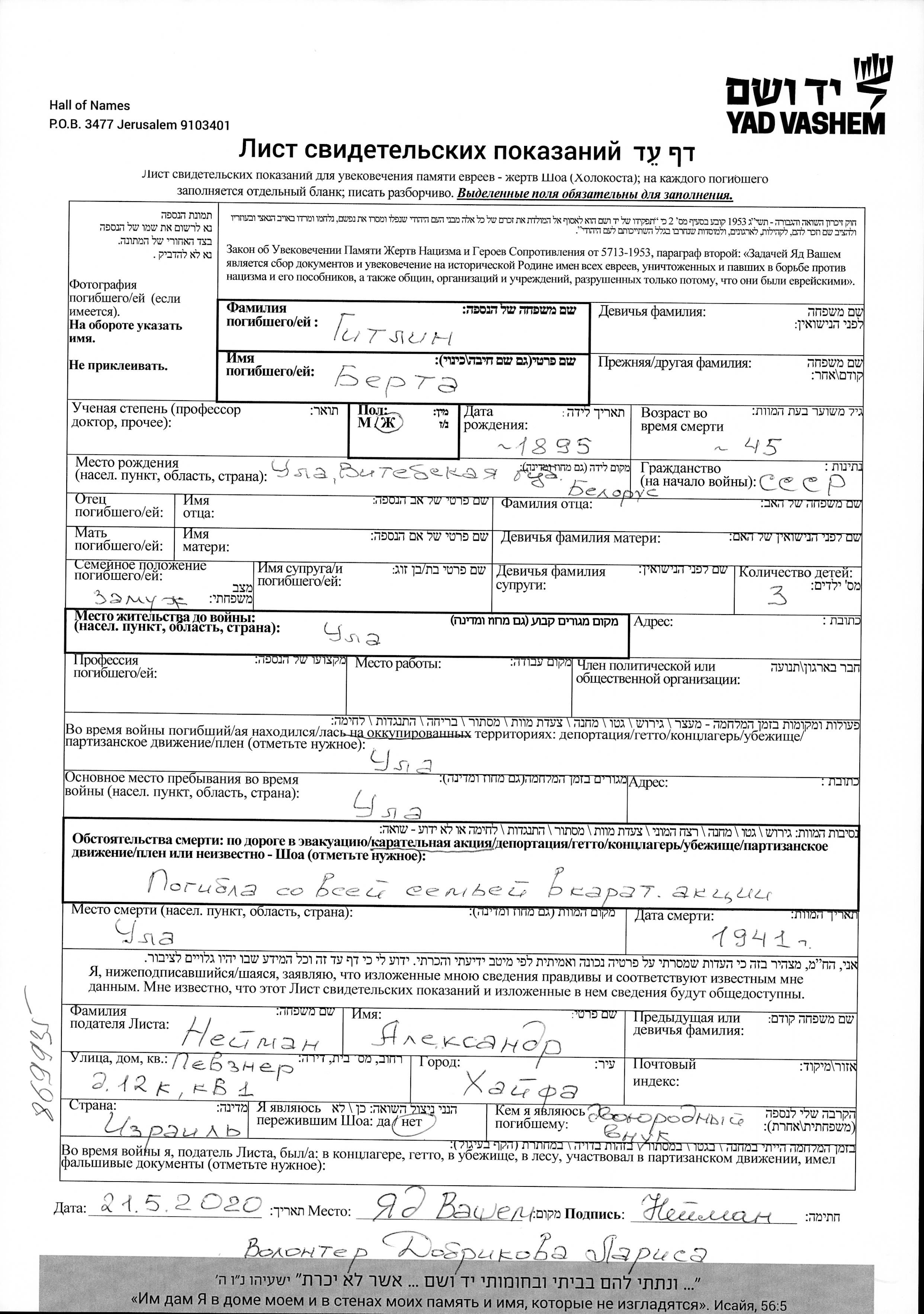 Gitlin Berta 1895 Ula, Belorussia (USSR) Page of Testimony