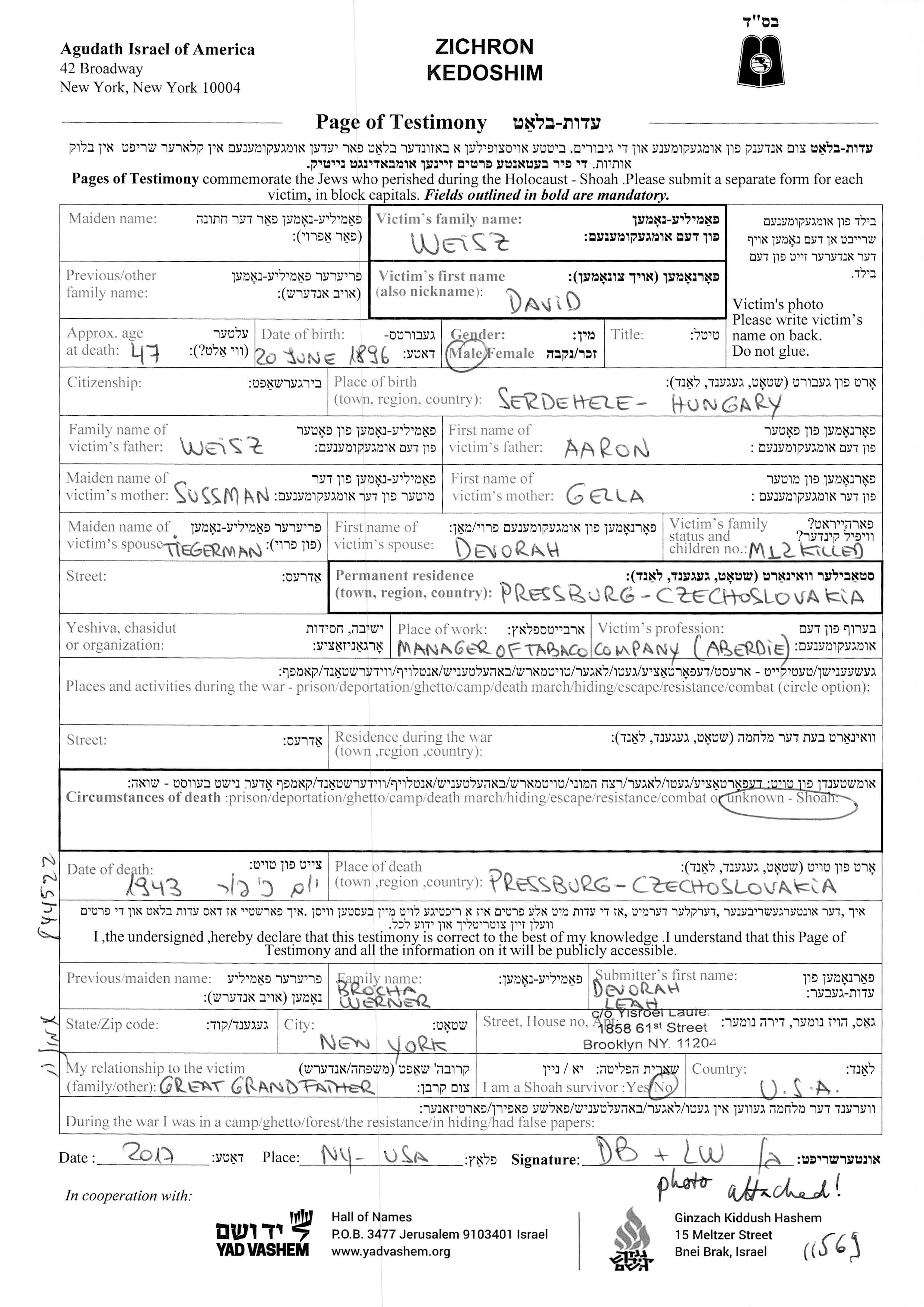 Weisz David 1896 Pressburg, Czechoslovakia Page of Testimony