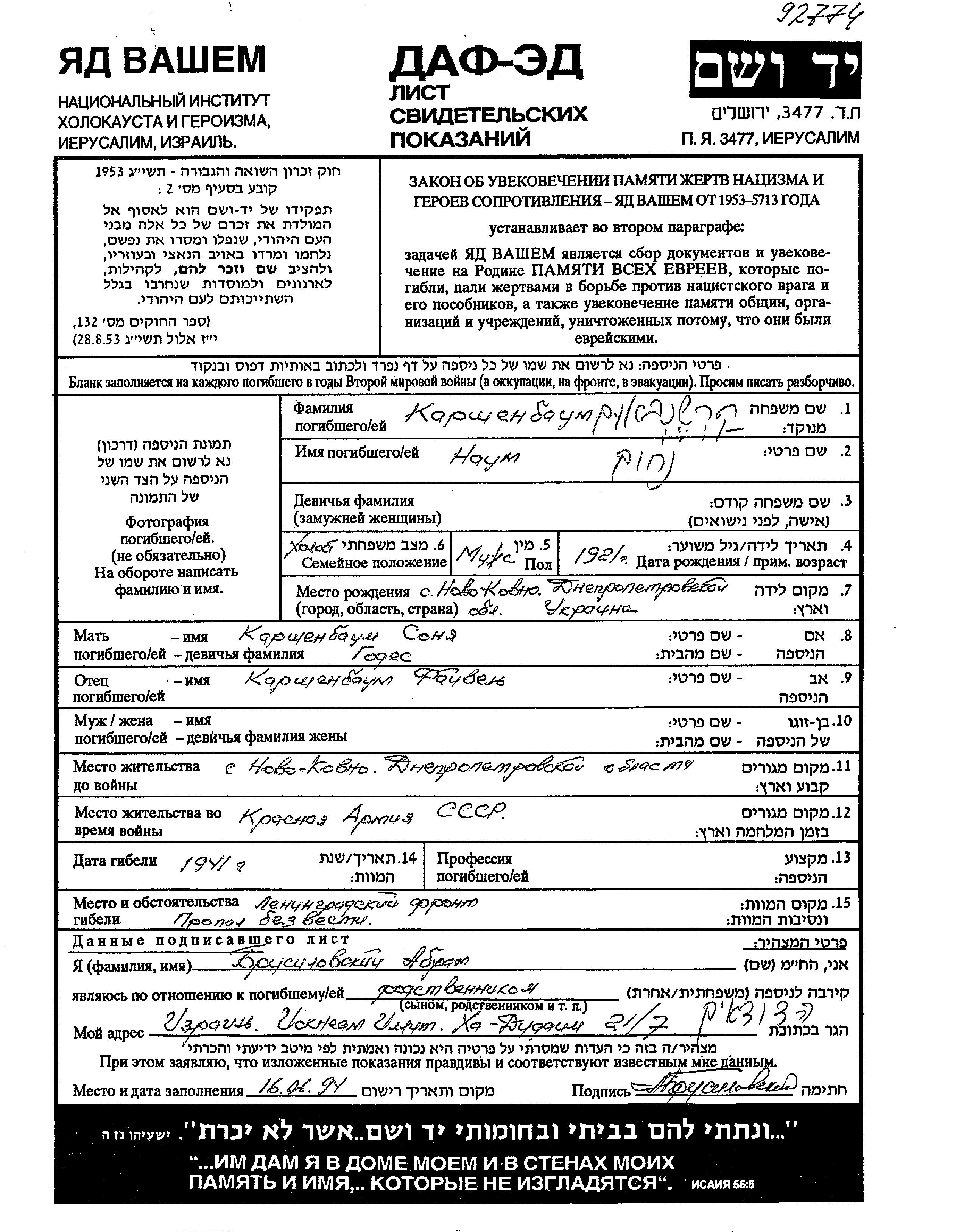 Karshenbaum Naum 1921 Novo Kovno, Ukraine (USSR) Page of Testimony