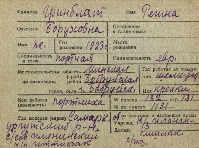 | Grinblat | Regina | 1923 | Bobruysk, Belorussia (USSR) | List of evacuated persons |