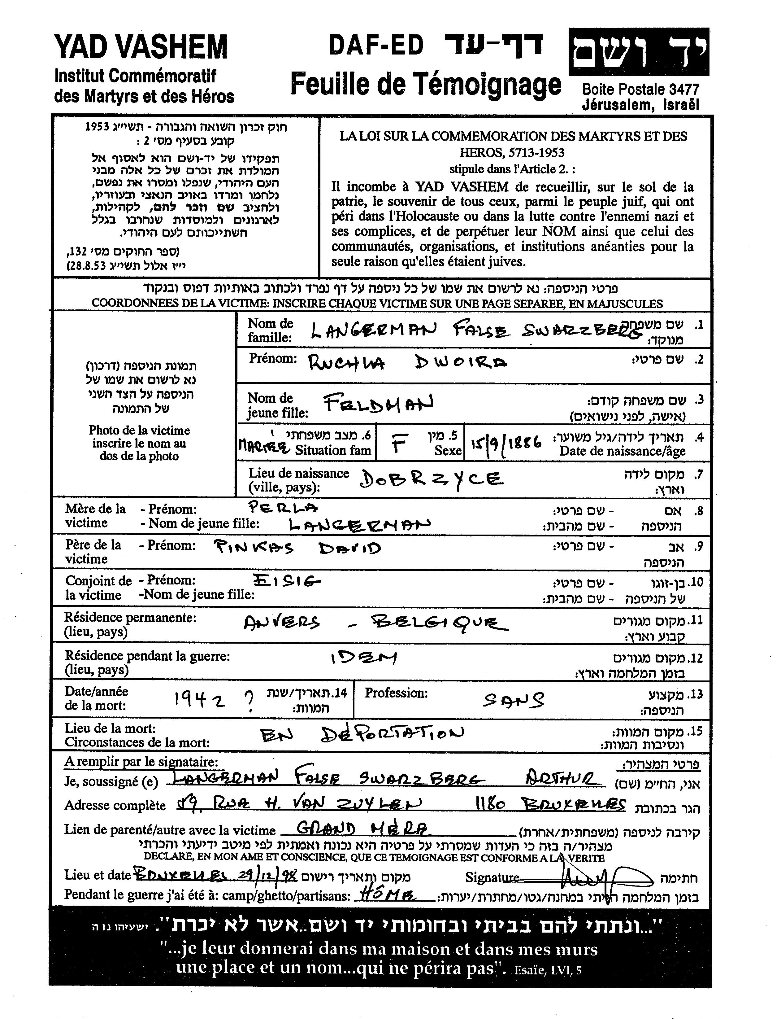 | Langerman Swarzberg | Ruchla Dwoira | 1886 | Anvers, Belgium | Page of Testimony |