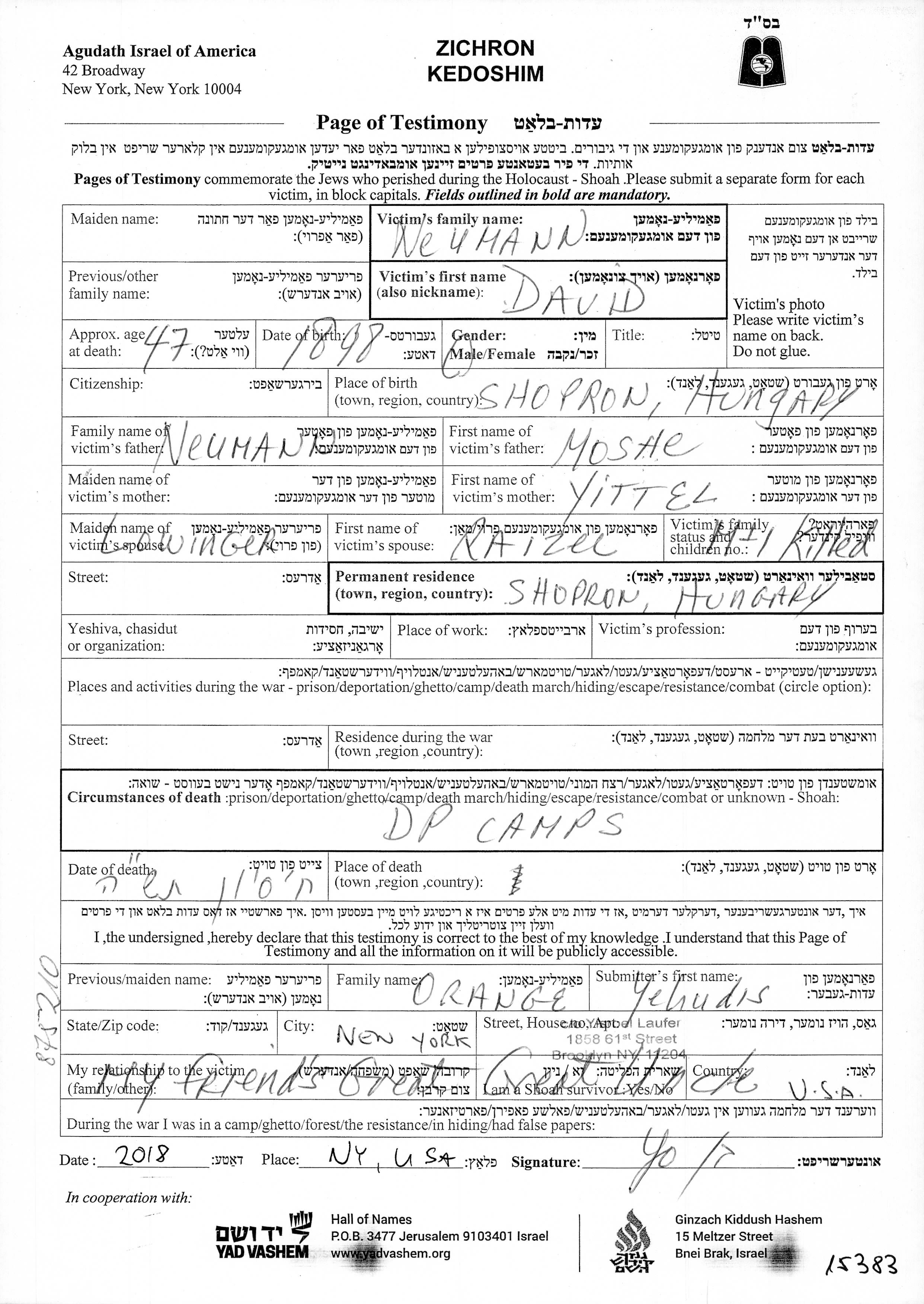 Yad Vashem - Pages of Testimony Names Memorial Collection