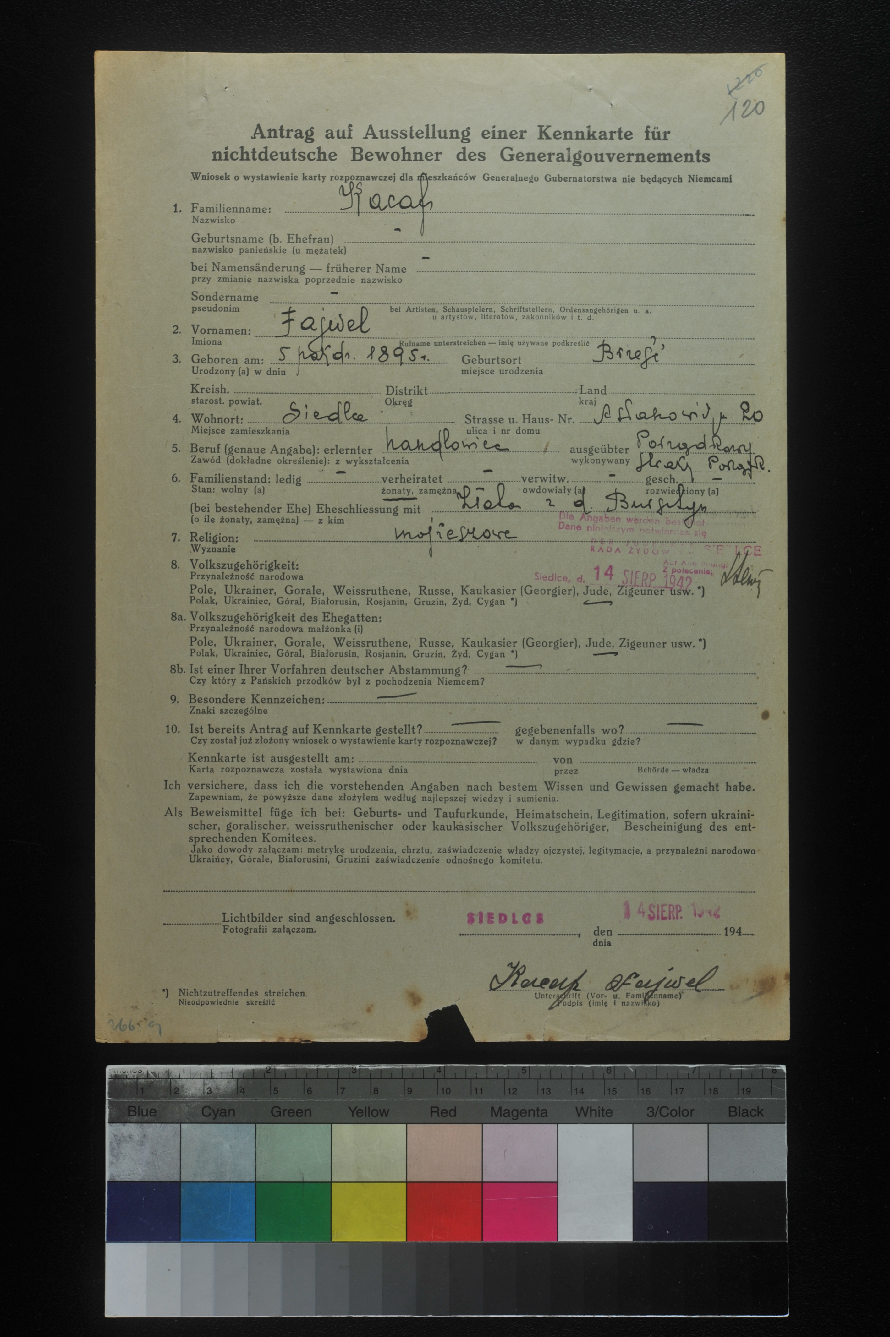 Fajwel Kacaf was born in Brzeg, Poland, 1895. He was a merchant and married to Złata nee Bursztyn. Prior to WWII he lived in Siedlce, Poland. During the war he was in Siedlce, Poland.