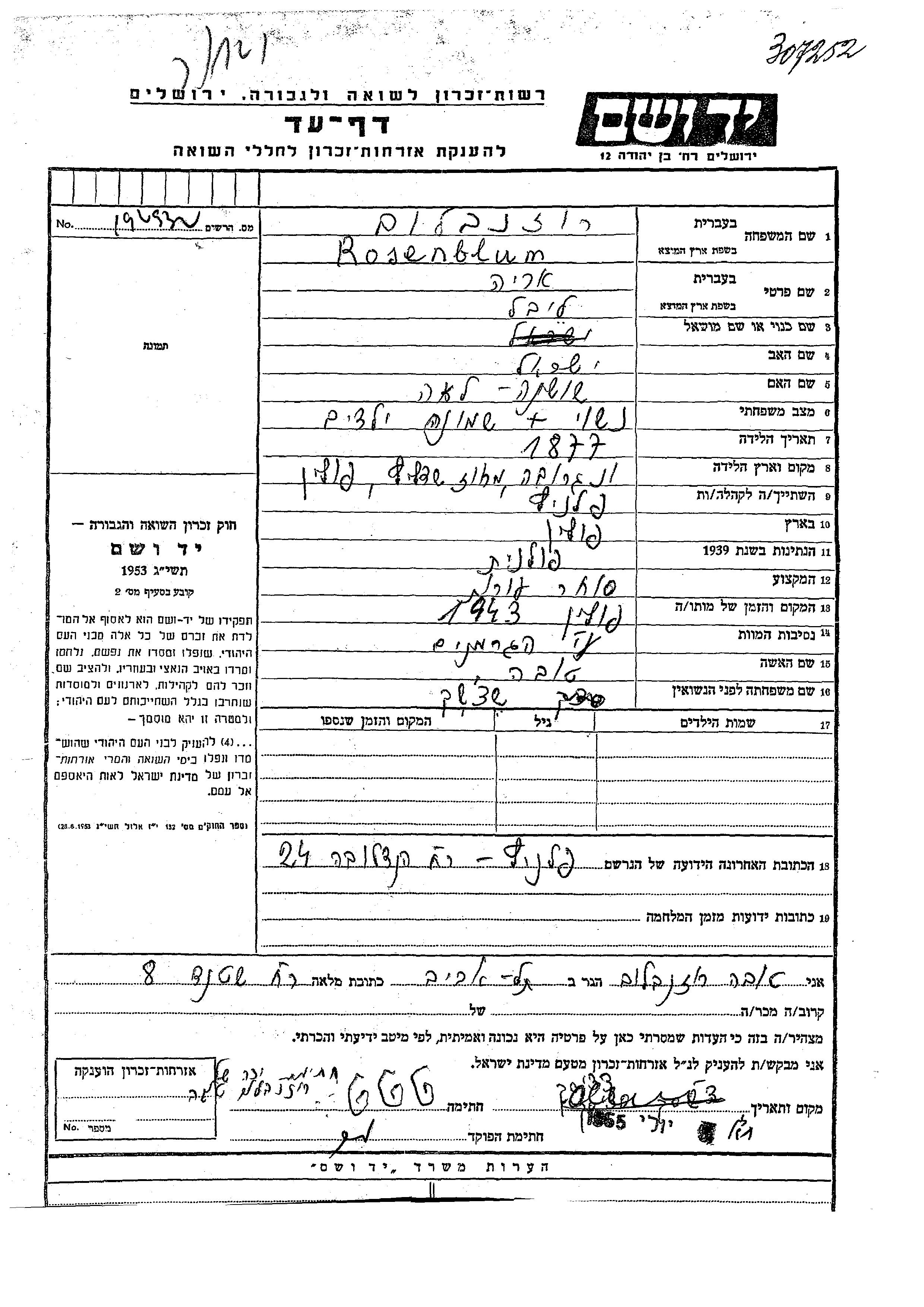 Arie Leibel Rosenblum was born in Wegrow, Poland, 1877. Prior to WWII he lived in Poland.