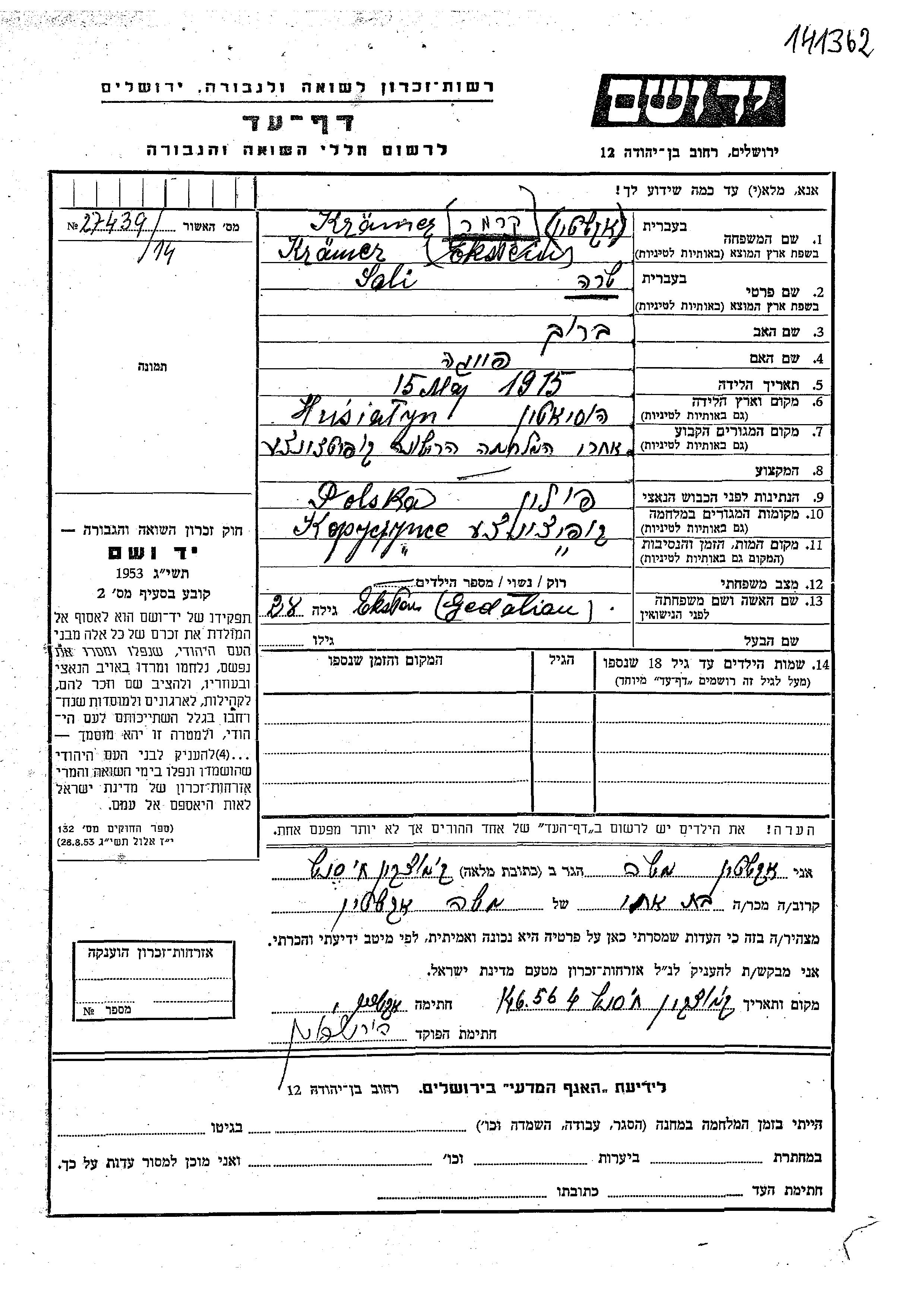 Kremer Sali Sara 1915 Kopyczynce, Poland Page of Testimony