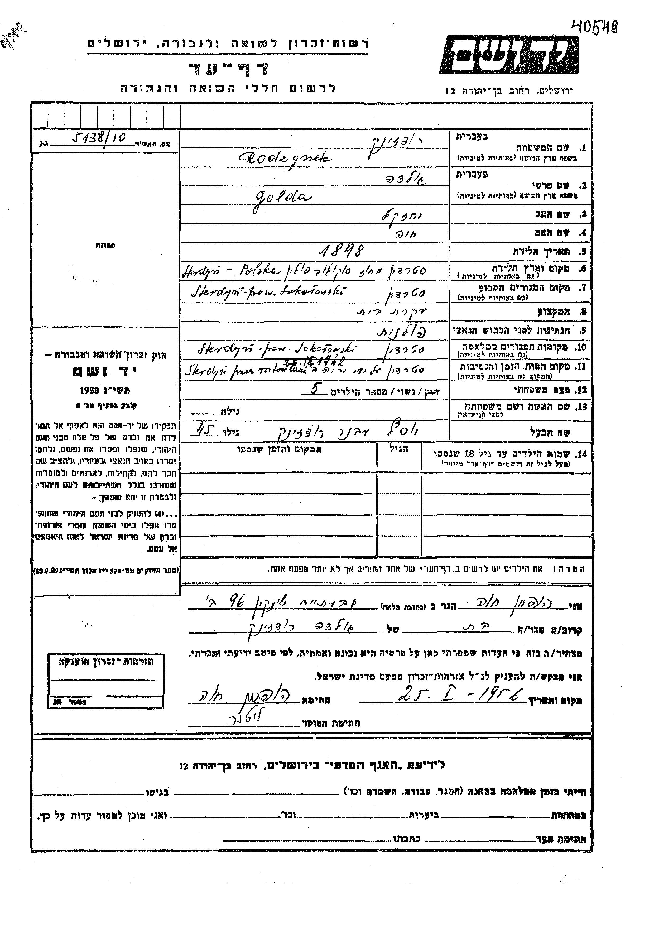 Golda Rodzynek was born in Sterdyn, Poland, 1898 to Yekhezkel and Khava. She was a housewife and married to Yosef Avner. Prior to WWII she lived in Sterdyn, Poland. During the war she was in Sterdyn, Poland. Golda was murdered in the Shoah. Place of death: Sterdyn, Poland, 25/04/1942.