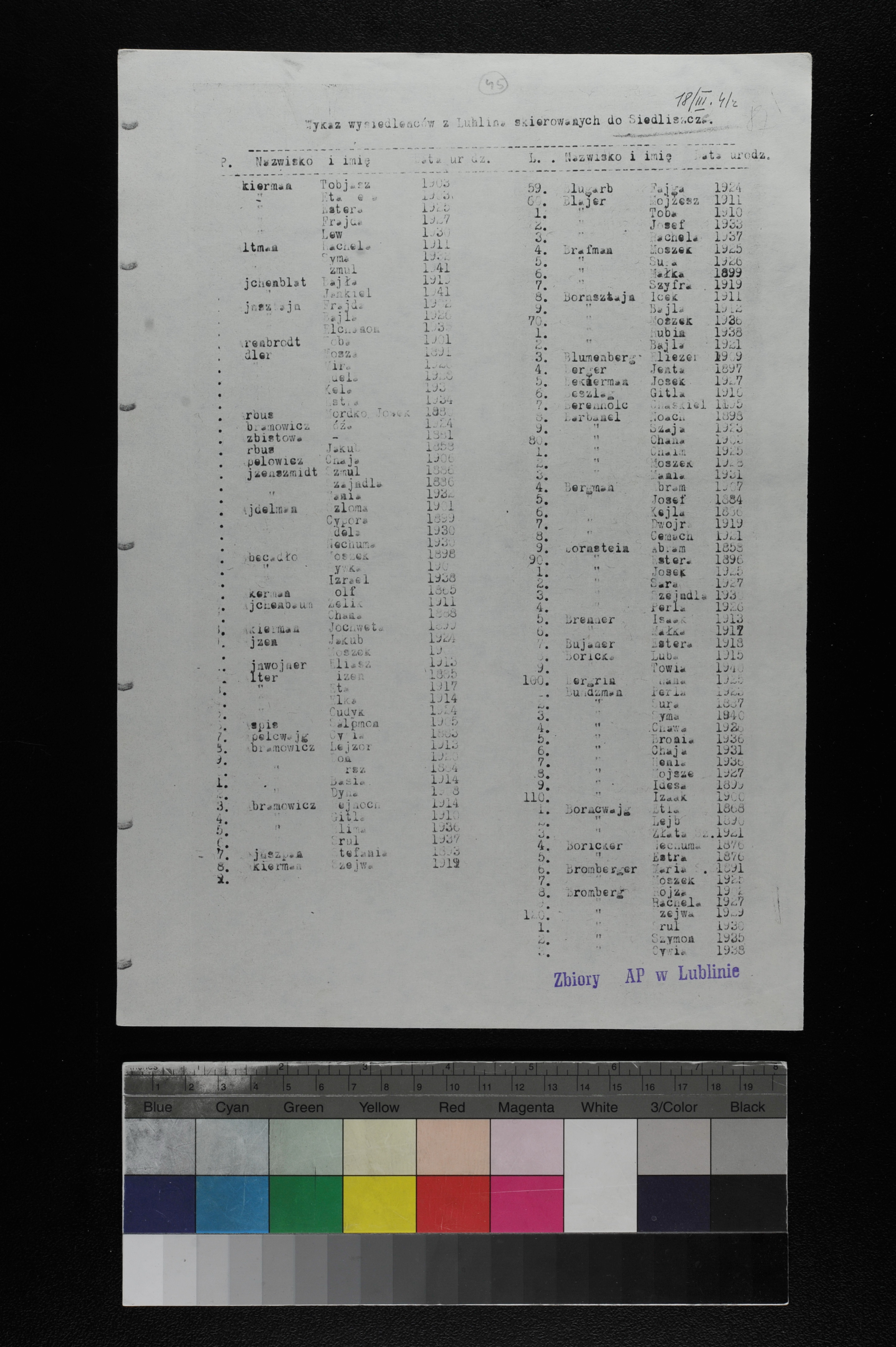 Lists of Jews deported from Lublin to the Belzyce, Chodel, Lubartow, Rejowiec and Siedliszcze camps, March 1941