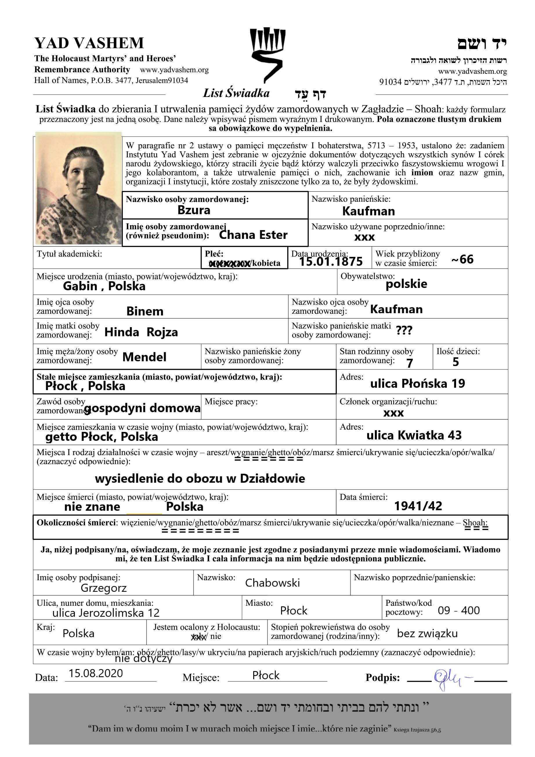 Chana Ester Bzura nee Kaufman was born in Gabin, Poland, 1875. She was a housewife. Prior to WWII she lived in Plock, Poland. Chana Ester was murdered in the Shoah. Place of death: Poland.