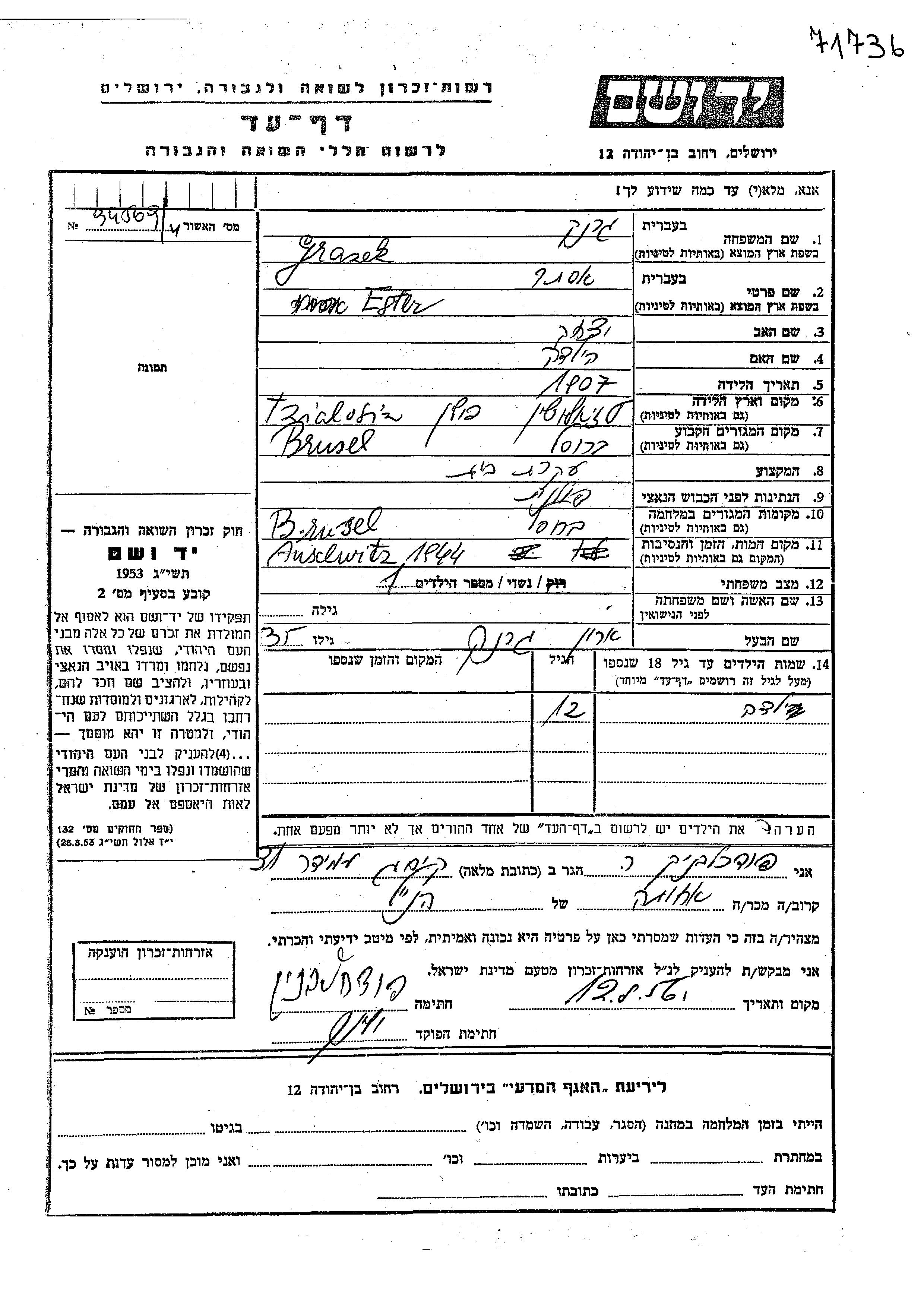 Esthera Granek nee Blade was born in Dzialoszyn, Poland, 1905. Prior to WWII she lived in Bruxelles, Belgium. Esthera was murdered in the Shoah. Place of death: Auschwitz, Poland, 1944.