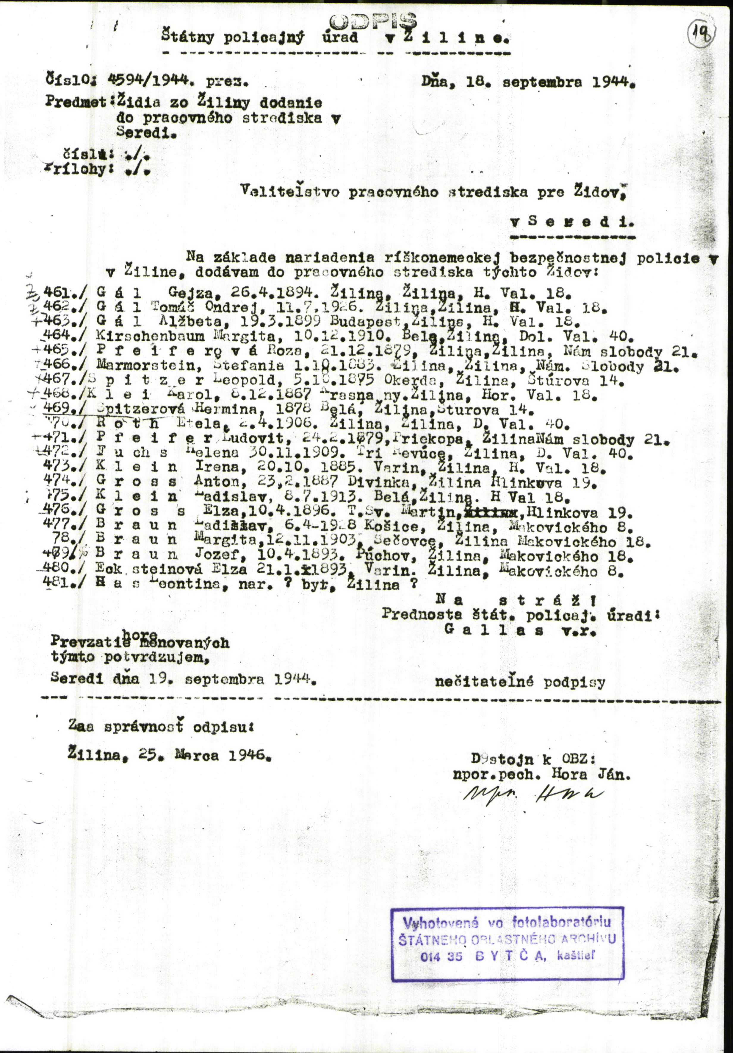 Lists of Jews from Zilina deported to Sered camp in 1944 and in January 1945