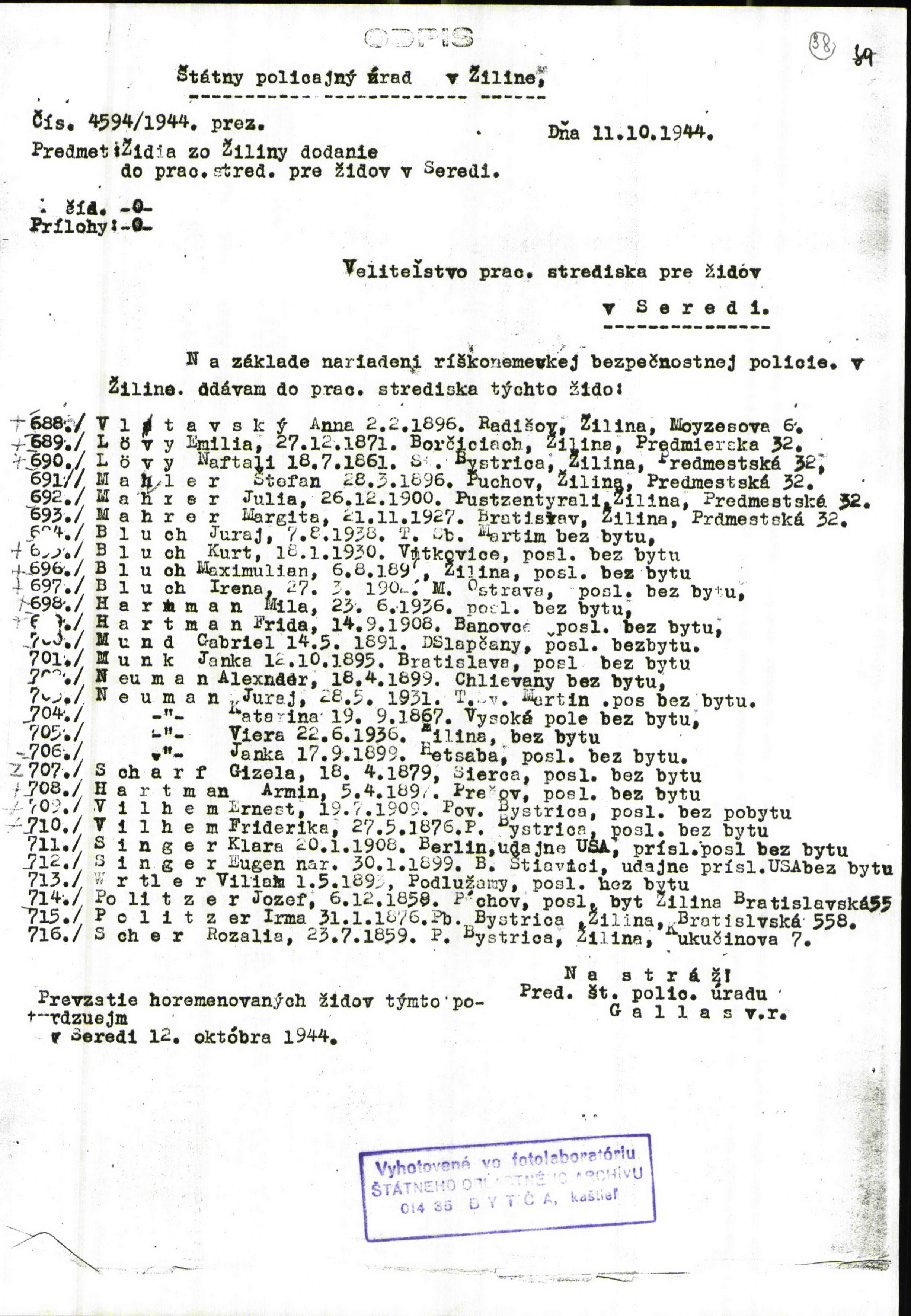 Lists of Jews from Zilina deported to Sered camp in 1944 and in January 1945