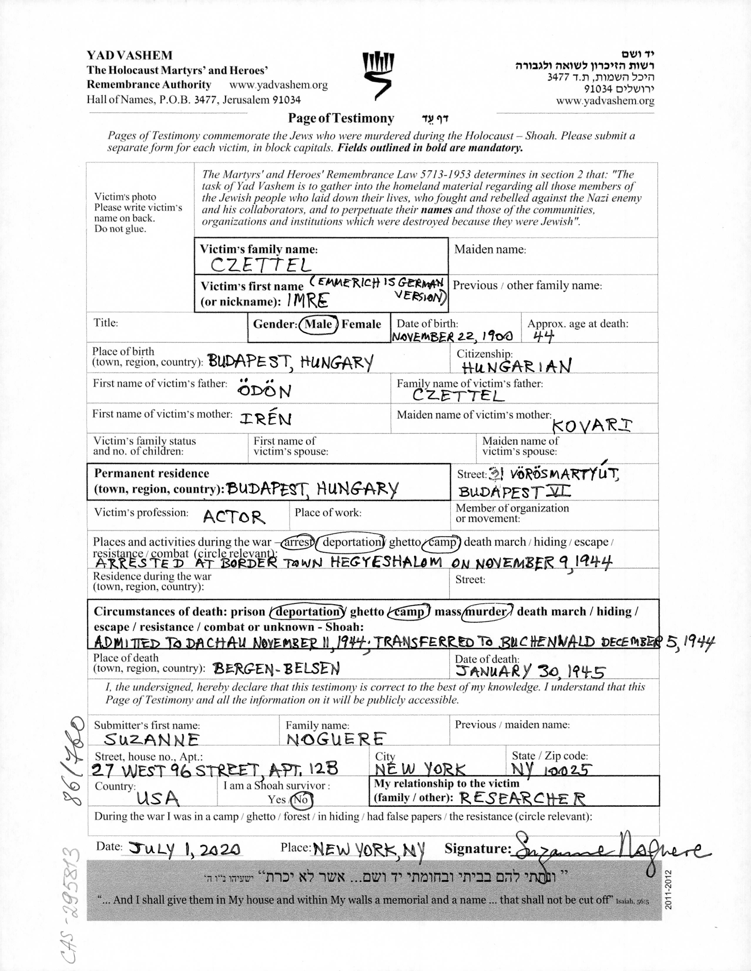 Czettel Imre Emmerich 1900 Budapest, Hungary Page of Testimony