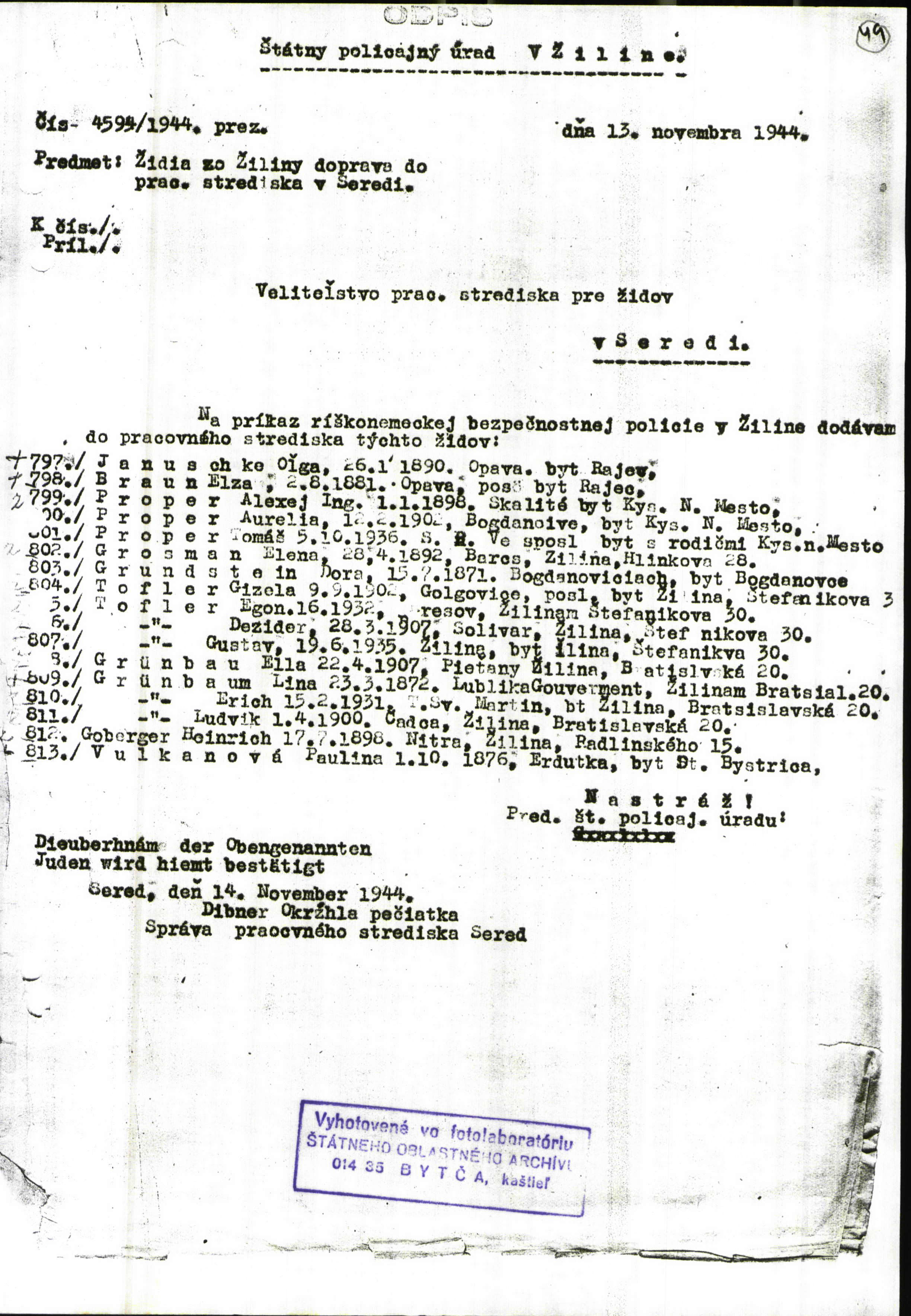 Lists of Jews from Zilina deported to Sered camp in 1944 and in January 1945