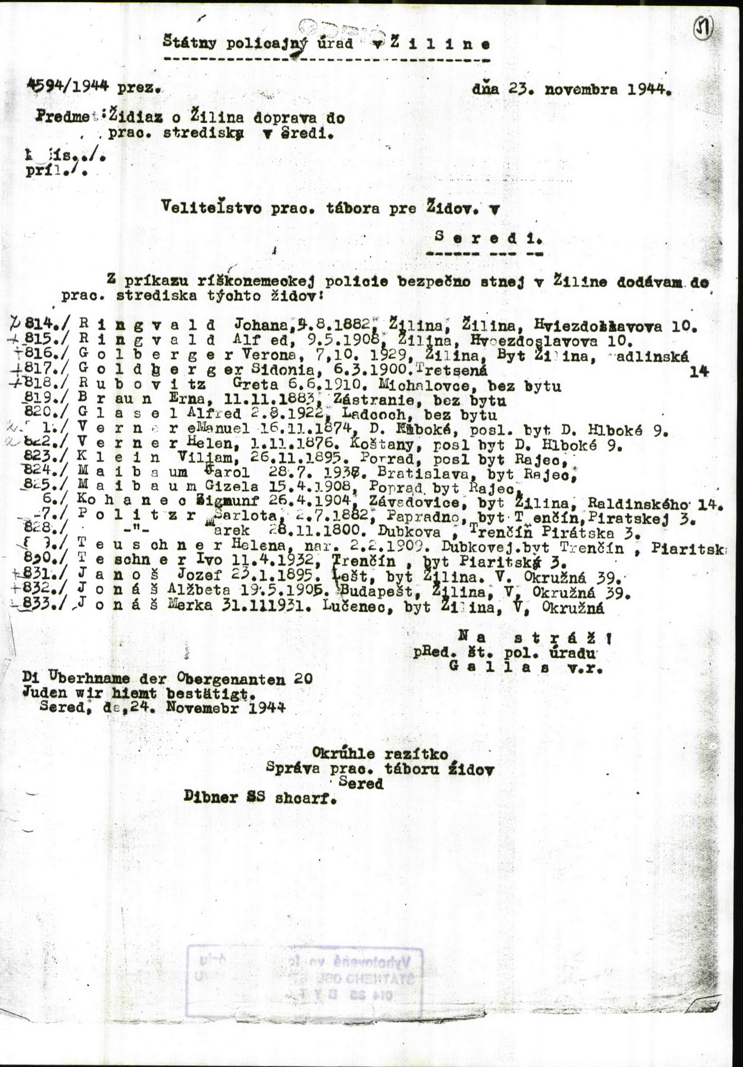 Lists of Jews from Zilina deported to Sered camp in 1944 and in January 1945