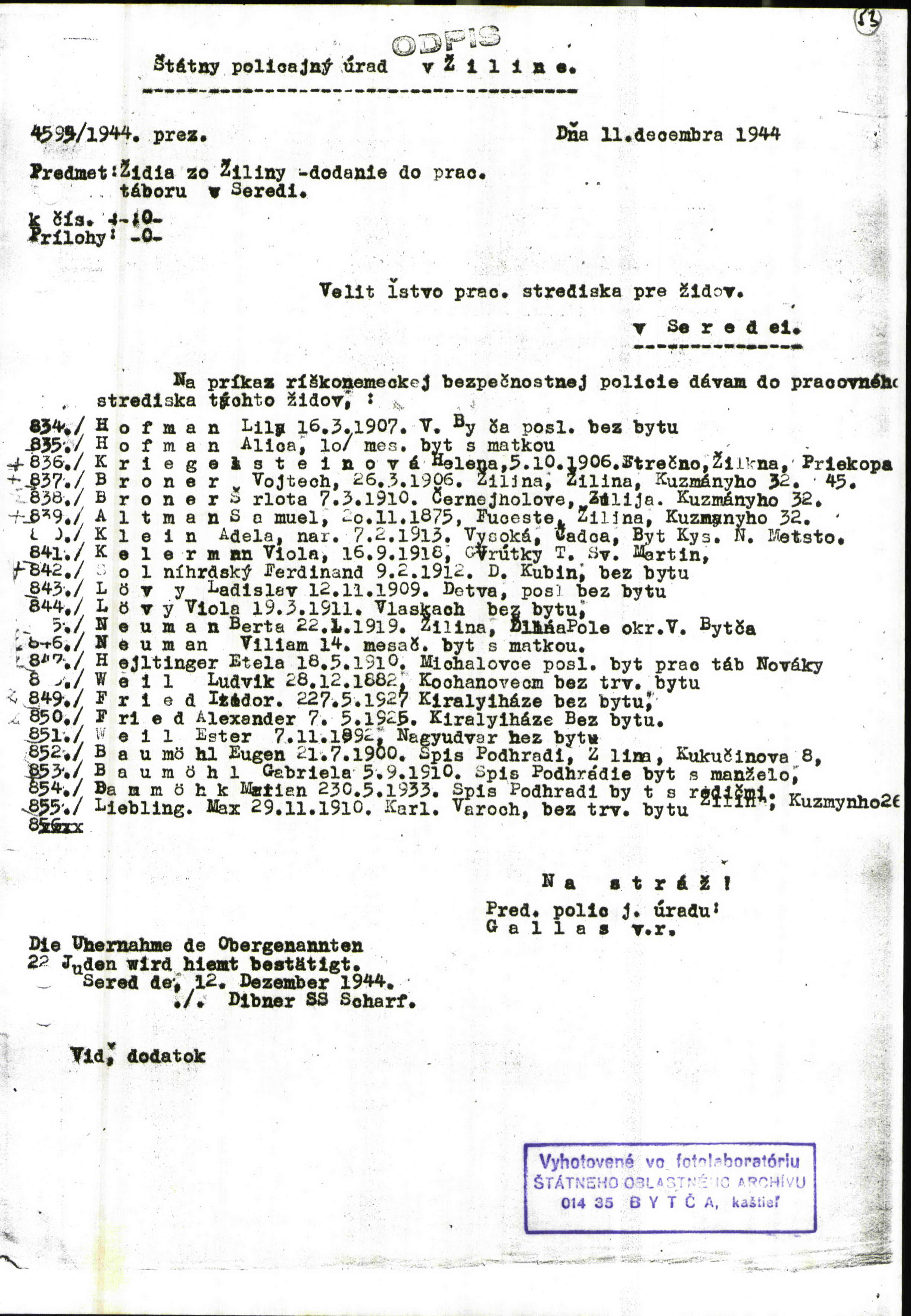 Lists of Jews from Zilina deported to Sered camp in 1944 and in January 1945