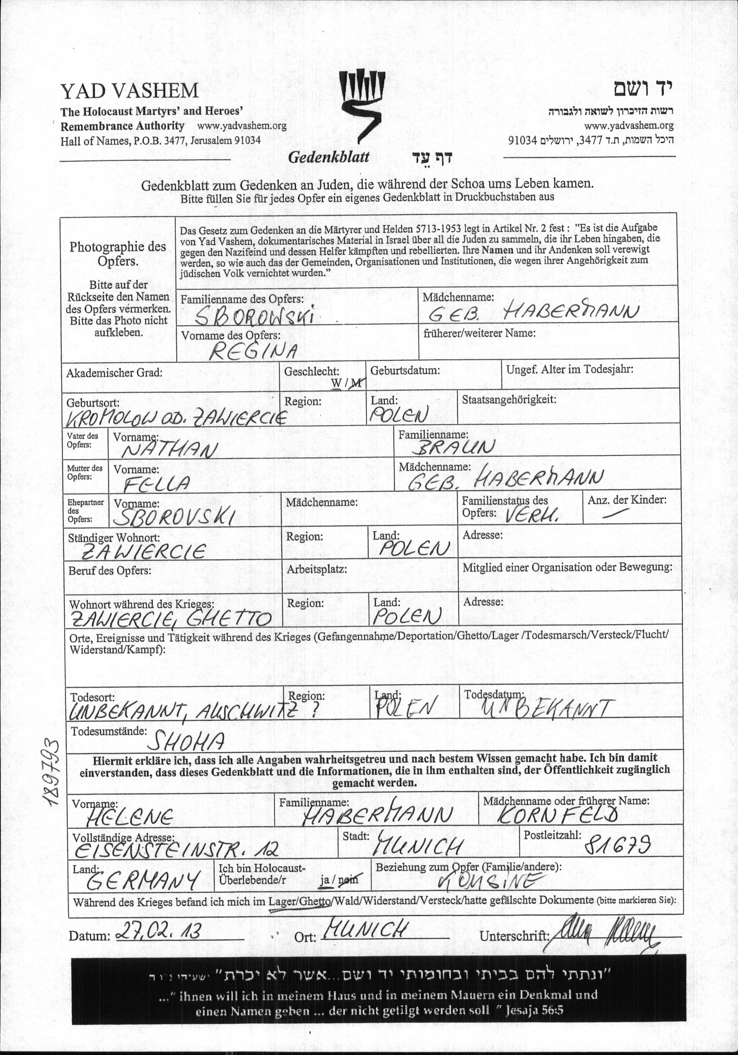 Regina Sborowski nee Habermann Browner was born in Zawiercie, Poland, 1915. Prior to WWII she lived in Zawiercie, Poland. Regina was murdered in the Shoah. Place of death: Auschwitz, Poland.