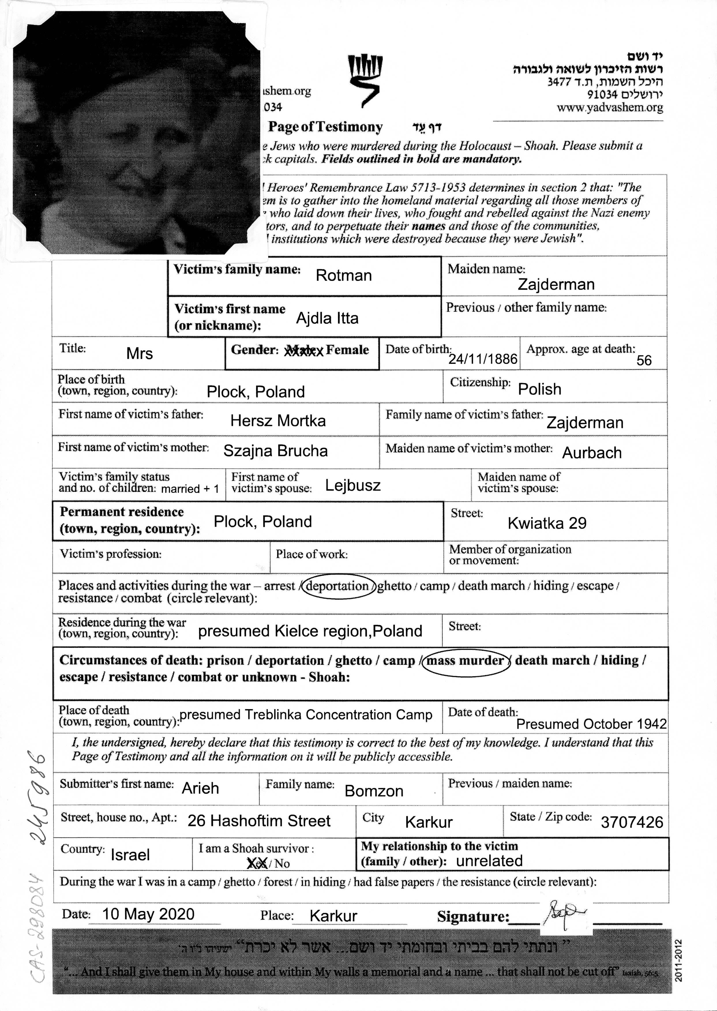 Ajdla Itta Rotman nee Zajderman was born in Plock, Poland, 1886. Prior to WWII she lived in Plock, Poland.