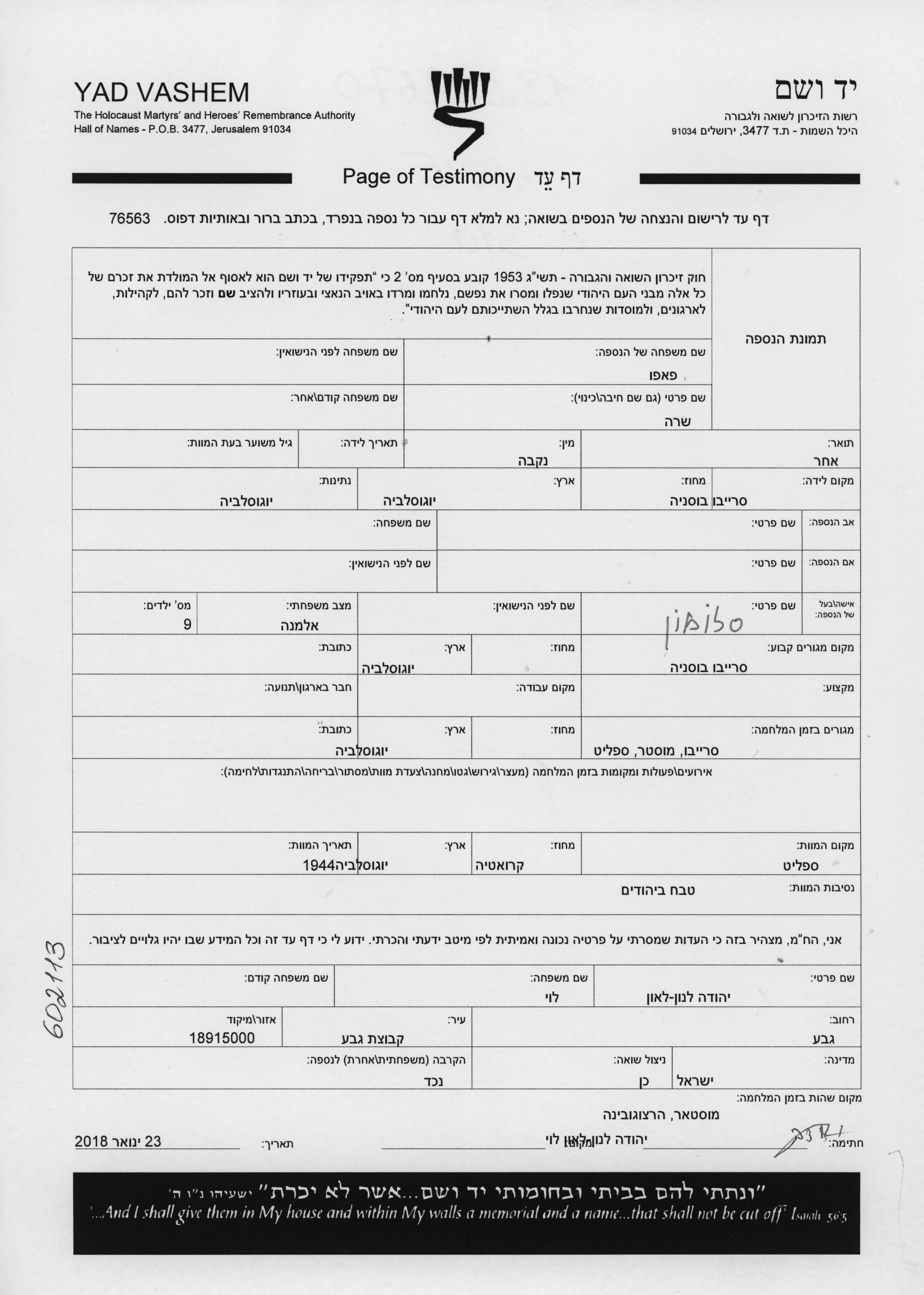 Papo Sara Sarajevo, Yugoslavia Page of Testimony (digital signed)