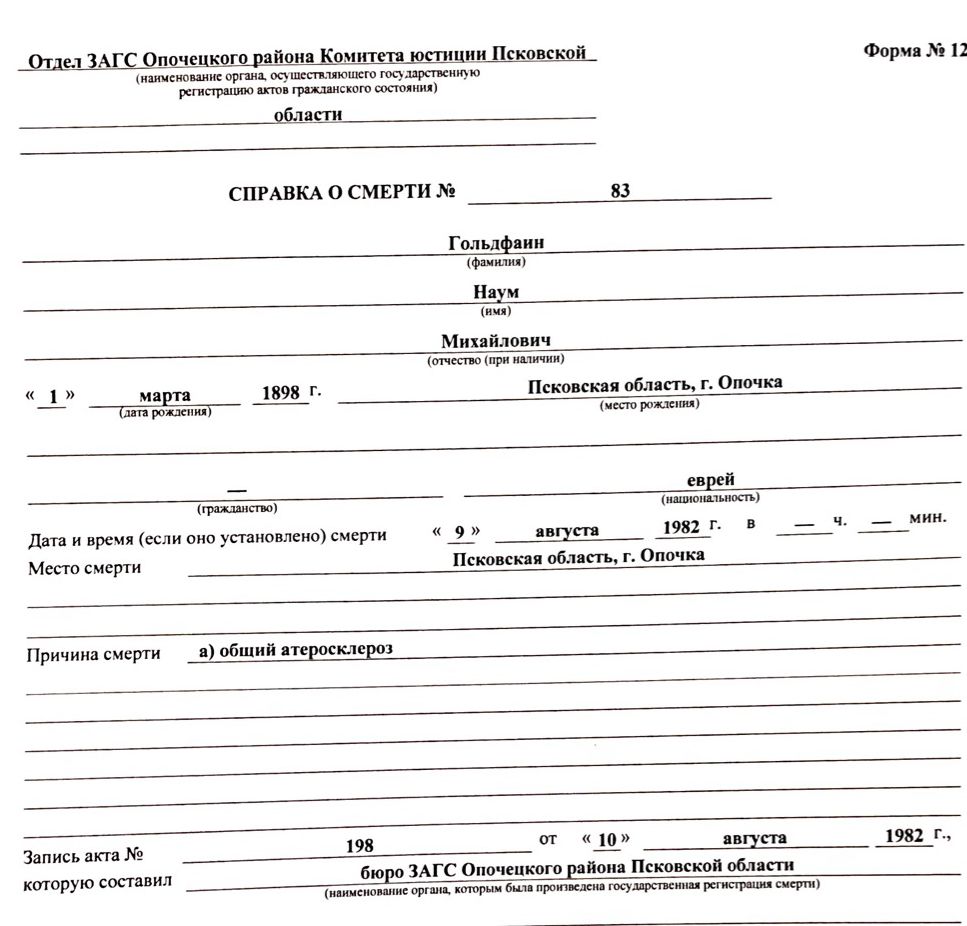Naum Goldfain was born, 1898. He was a warehouse foreman. Prior to WWII he lived in Opochka, Russia (USSR). Naum was registered following the evacuation/ in the interior of the Soviet Union.
