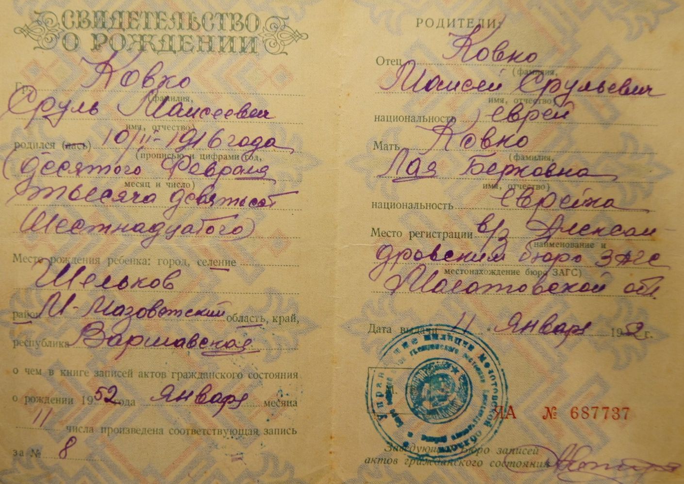 | Kovko | Srul | 1916 | unstated place, | Birth certificate |