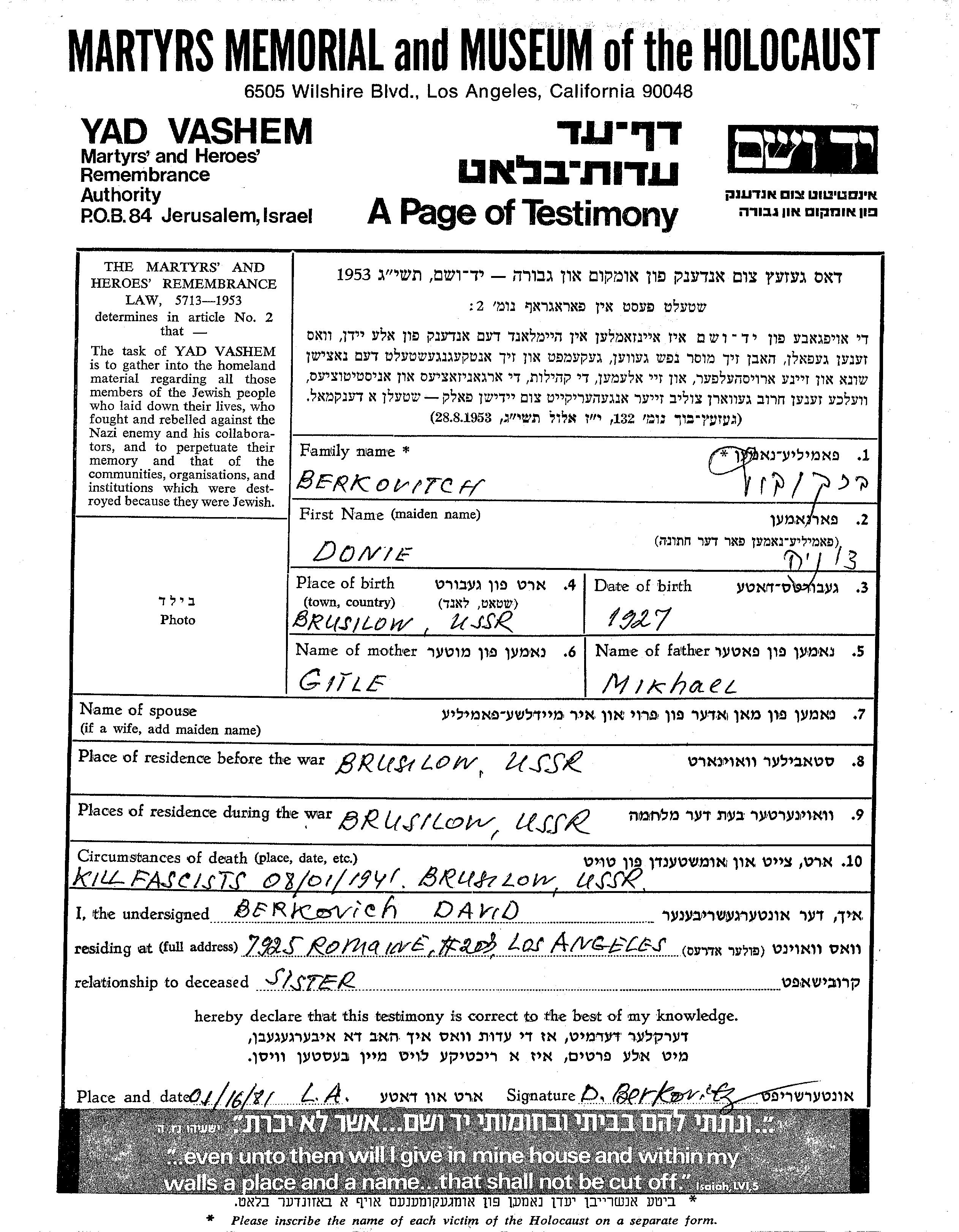 Donie Berkovitch was born in Brusilov, Ukraine (USSR), 1927 to Mikhael and Gitle. Prior to WWII she lived in Brusilov, Ukraine (USSR). During the war she was in Brusilov, Ukraine (USSR). Donie was murdered in the Shoah. Place of death: Brusilov, Ukraine (USSR), 08/01/1941.