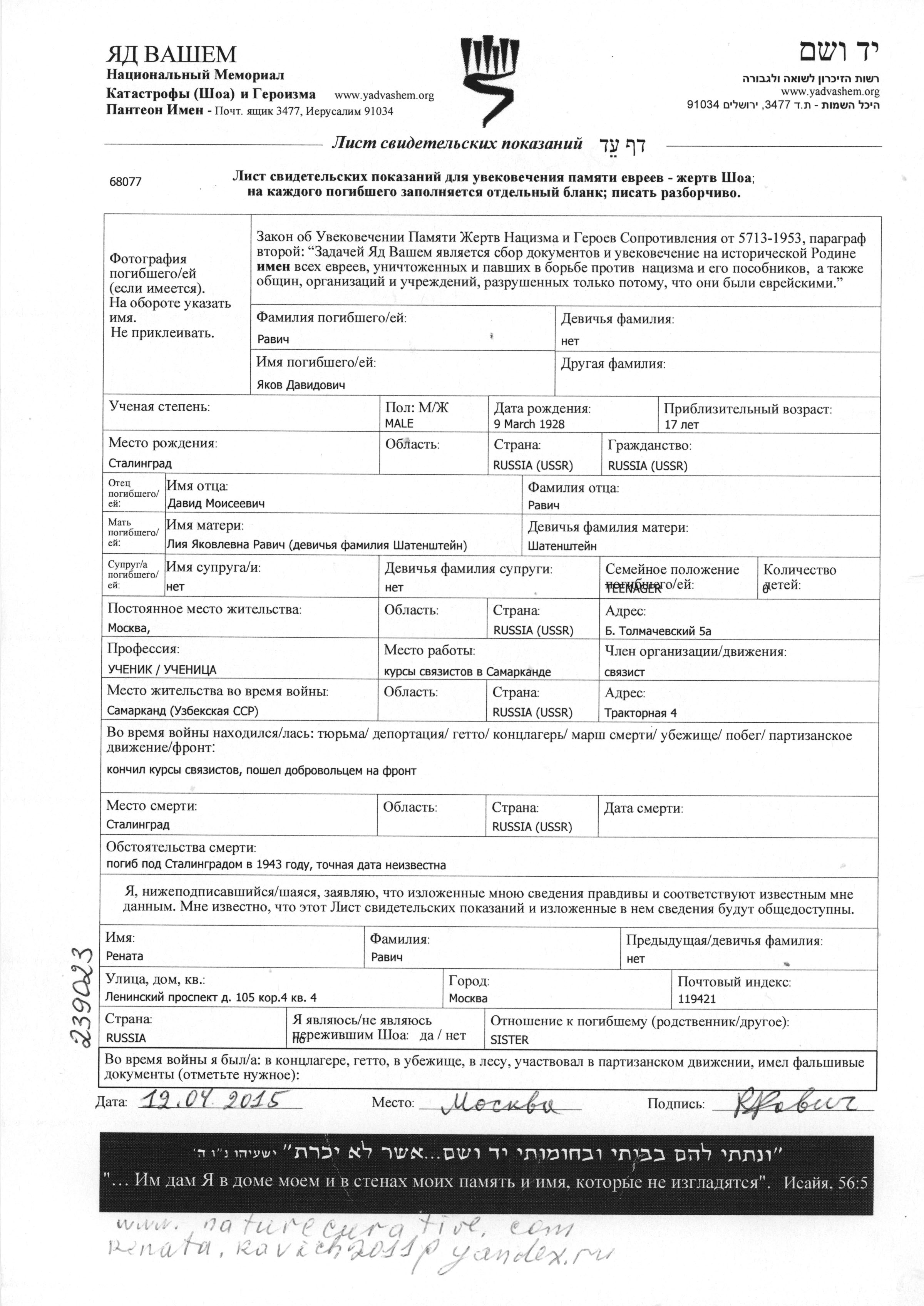 Yakov Ravich was born in Stalingrad, Russia (USSR), 1928. He was a pupil. Prior to WWII he lived in Moskva, Russia (USSR). Yakov was killed in military service in WWII. Place of death: Stalingrad, Russia (USSR), 1943.