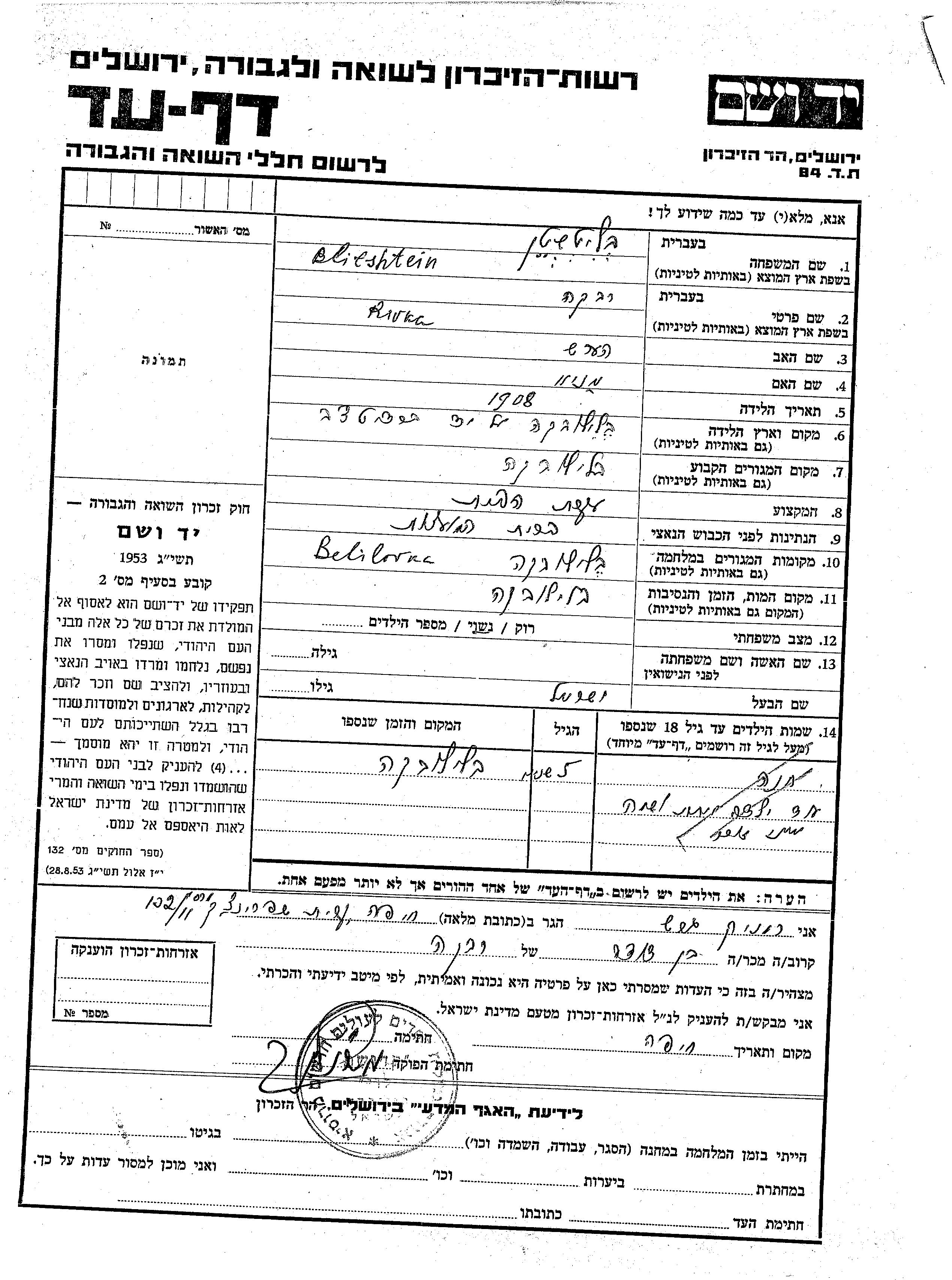Rivka Blitshtein was born in Belilivka, Ukraine (USSR), 1908 to Hersh and Mania. She was a housewife and married to Yisrael. Prior to WWII she lived in Belilivka, Ukraine (USSR). During the war she was in Belilivka, Ukraine (USSR). Rivka was murdered in the Shoah. Place of death: Belilivka, Ukraine (USSR).