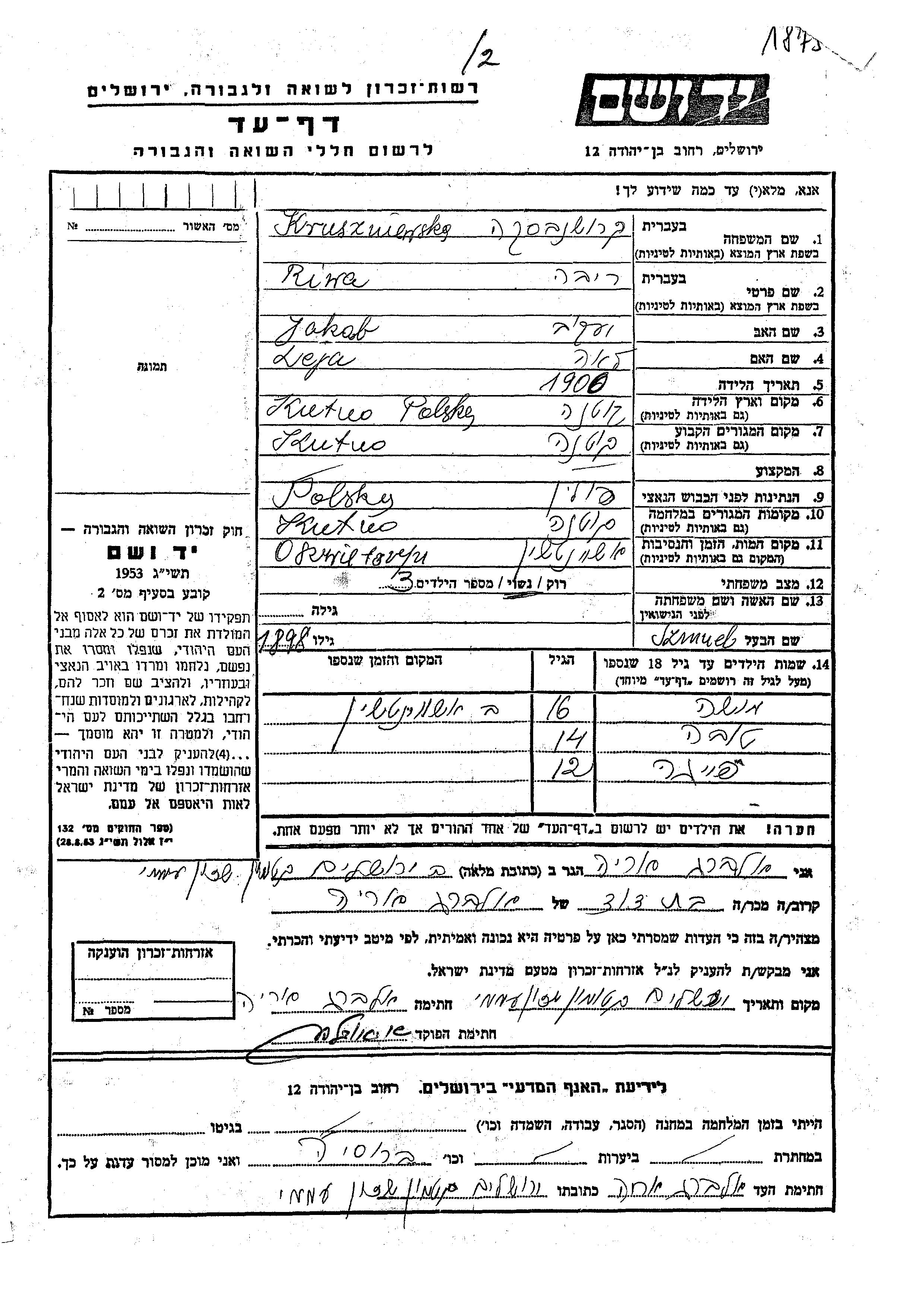 Kruszniewski Riwa 1900 Kutno, Poland Page of Testimony