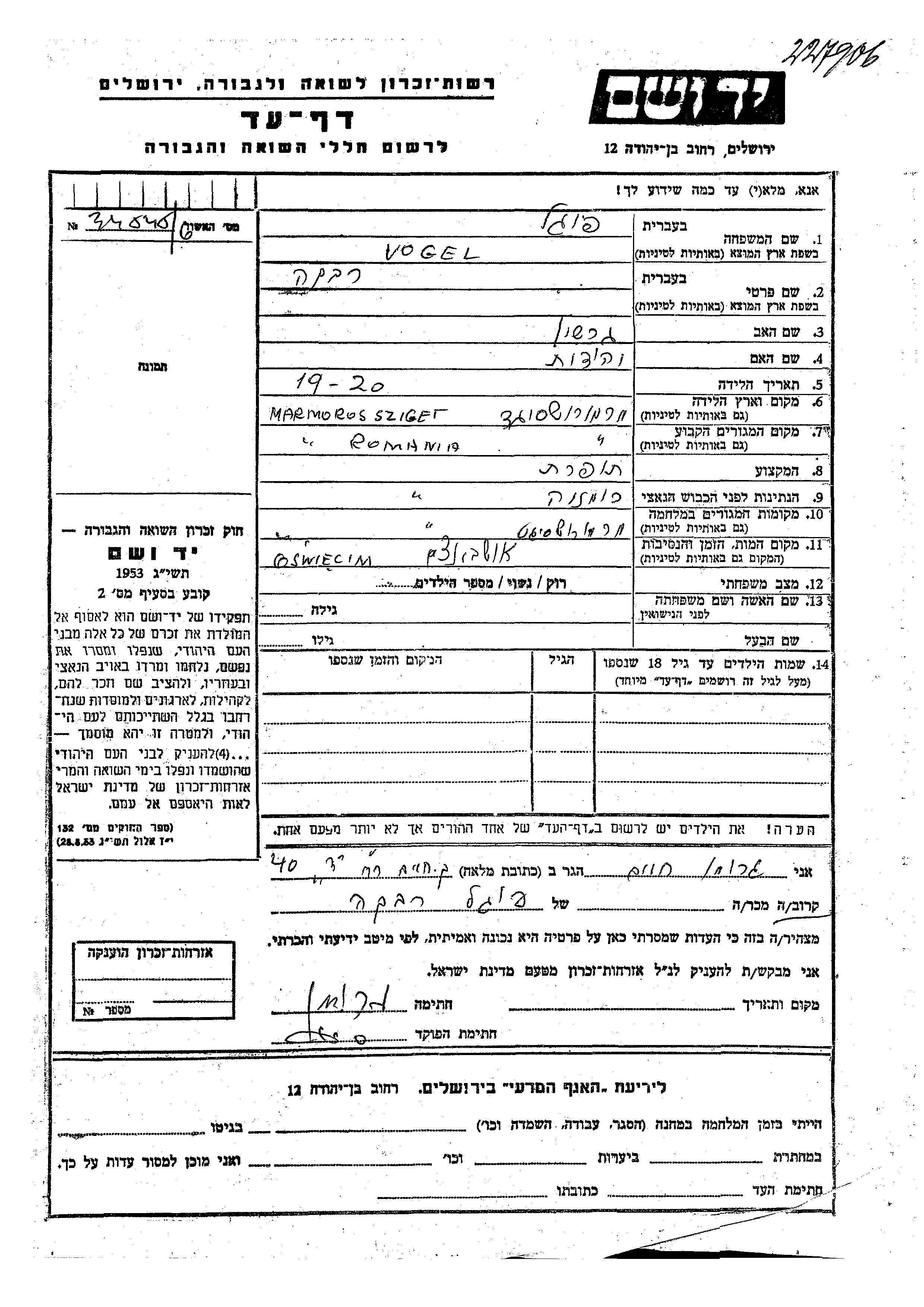 Vogel Rivka Marmorossziget, Romania Page of Testimony