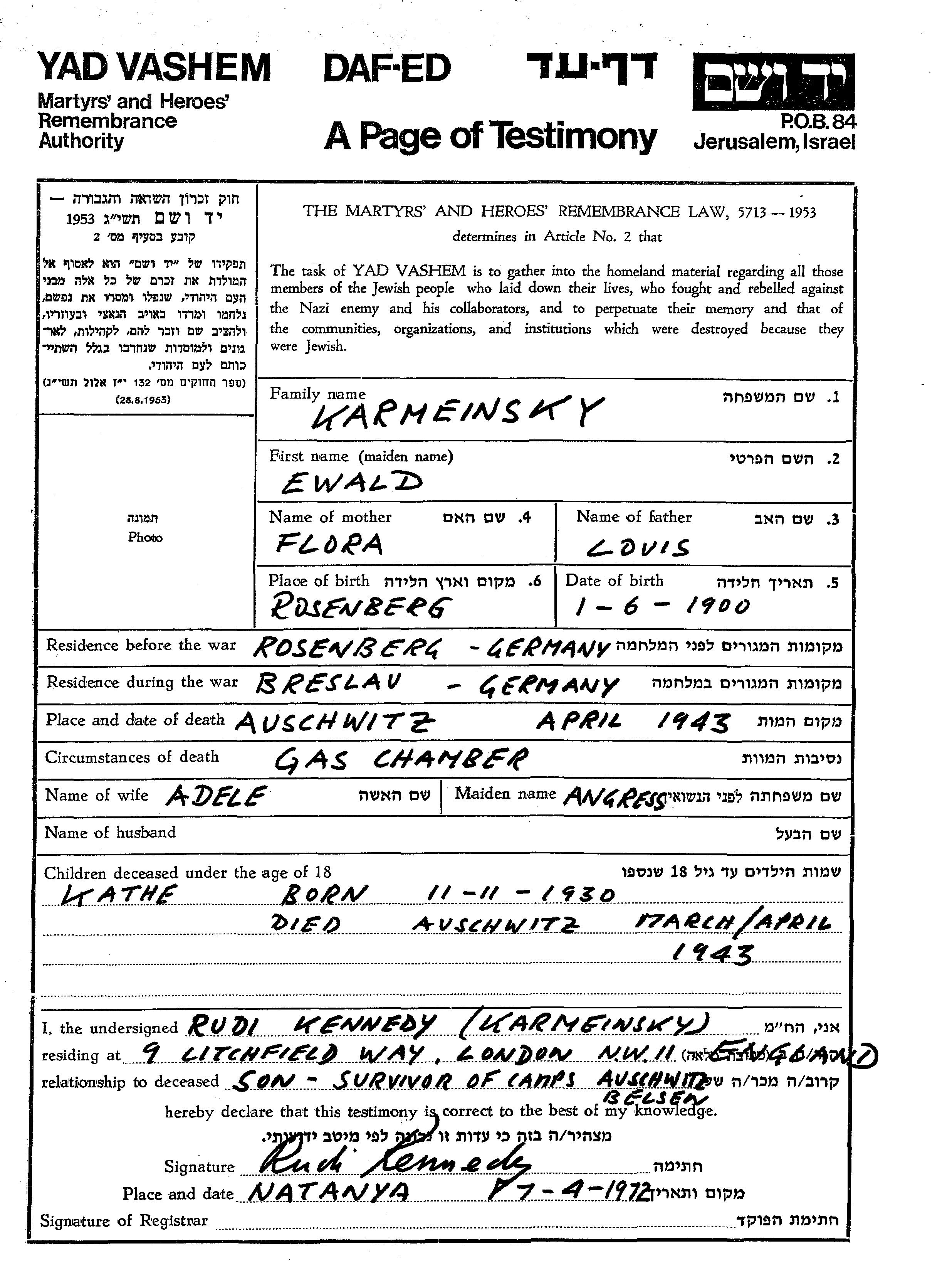 Ewald Karmeinsky was born in Rosenberg, Czechoslovakia, 1900 to Louis and Flora. He was married to Adele nee Angress. Prior to WWII he lived in Rosenberg, Germany. During the war he was in Breslau, Germany. Ewald was murdered in the Shoah. Place of death: Auschwitz, Poland, 1943.