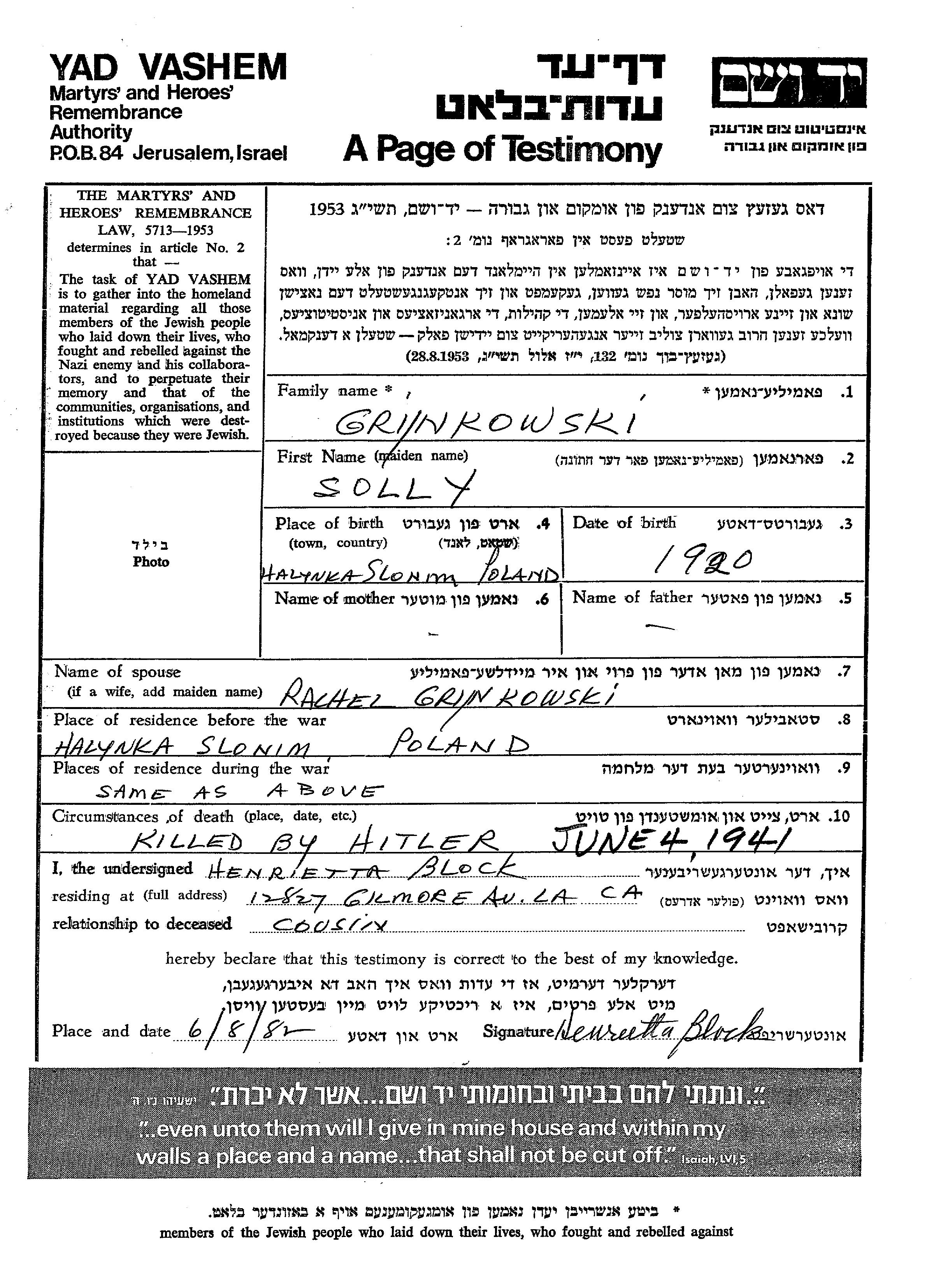 Solly Grynkowski was born in Halynka, Poland, 1920. Prior to WWII he lived in Halynka, Poland. During the war he was in Halynka, Poland. Solly was murdered in the Shoah. Place of death: unknown, 04/06/1941.