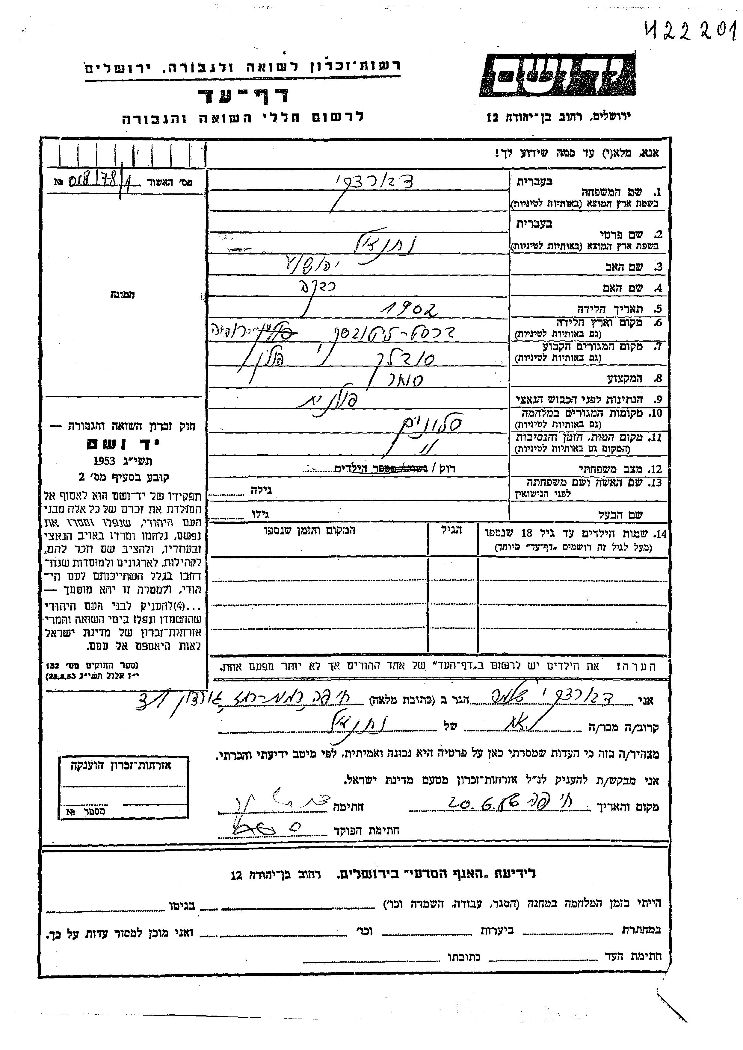 Natanel was murdered in the Shoah. Place of death: Slonim, Poland.