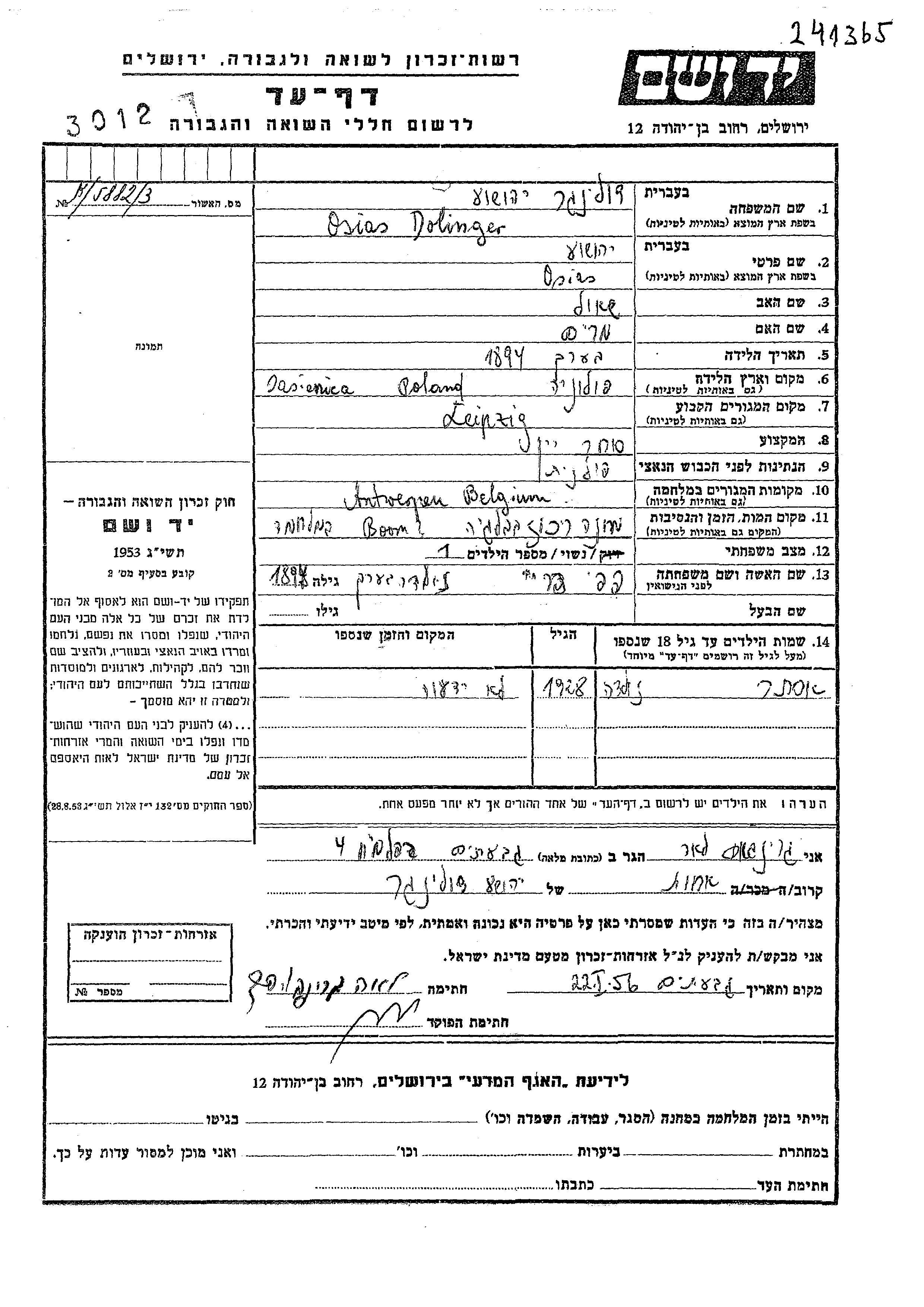 Osias Yehoshua Dolinger was born in Jasienica, Poland, 1894 to Shaul and Miriam. He was a wine merchant and married to Pepi nee Grin. Prior to WWII he lived in Leipzig, Germany. During the war he was in Antverpen, Belgium. Osias Yehoshua was murdered in the Shoah. Place of death: Boom, Belgium.