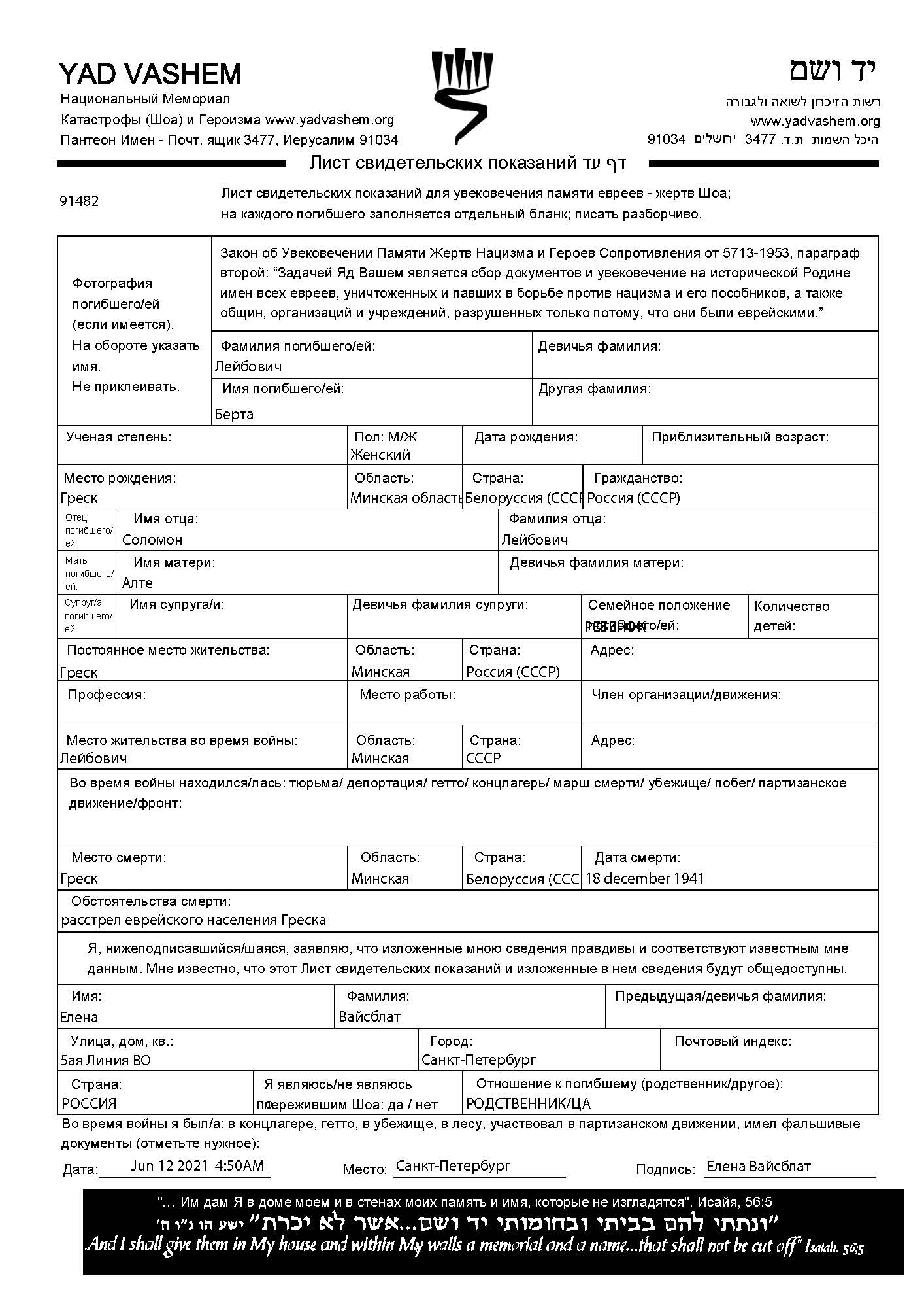 Berta Leybovich was born in Gresk, Belorussia (USSR) to Solomon and Alte. She was child. Prior to WWII she lived in Gresk, Belorussia (USSR). During the war she was in Gresk, Belorussia (USSR). Berta was murdered in the Shoah. Place of death: Gresk, Belorussia (USSR), 18/12/1941.