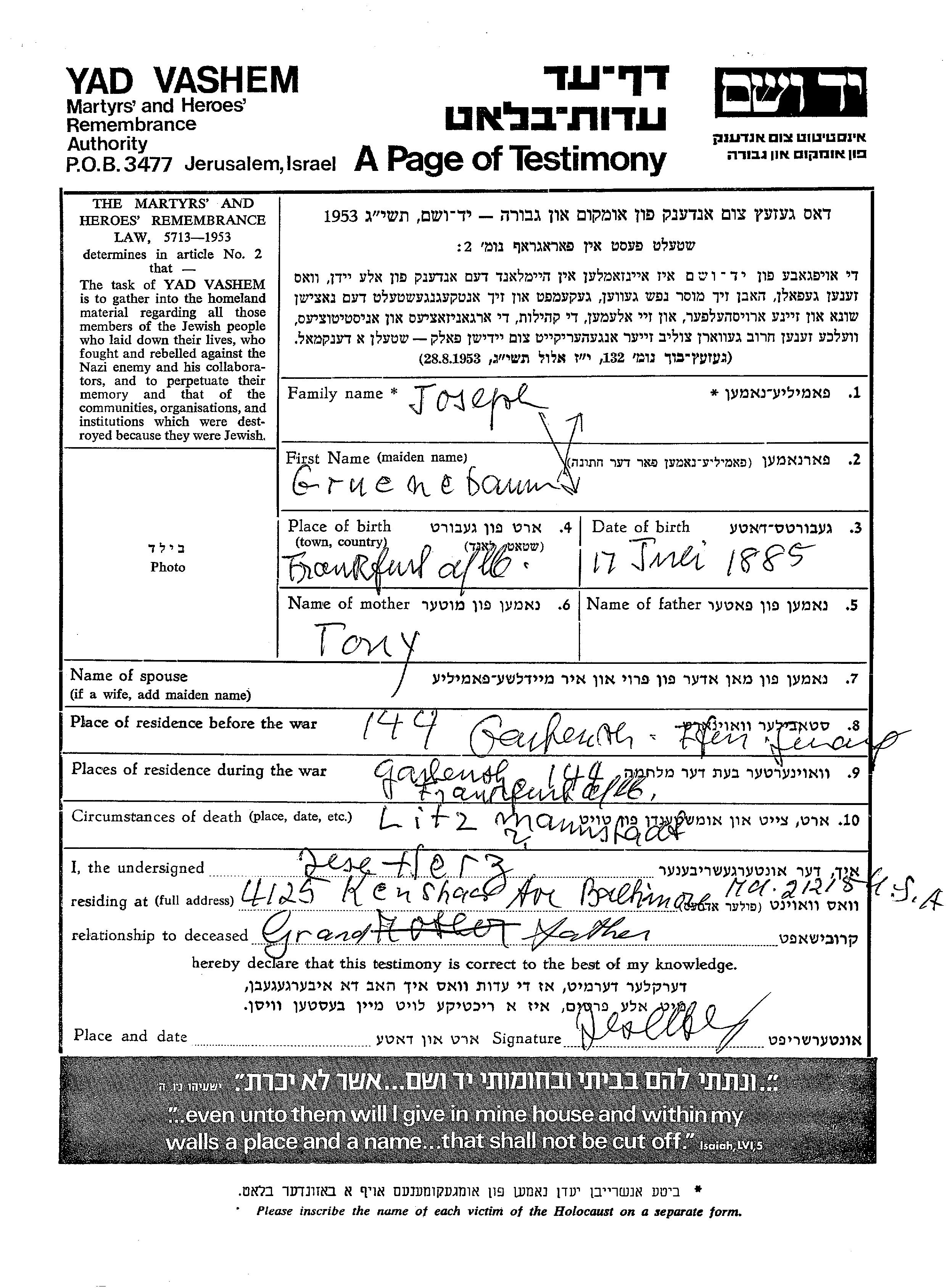 Gruenebaum Joseph 1885 Gerlinghausen, Germany Page of Testimony