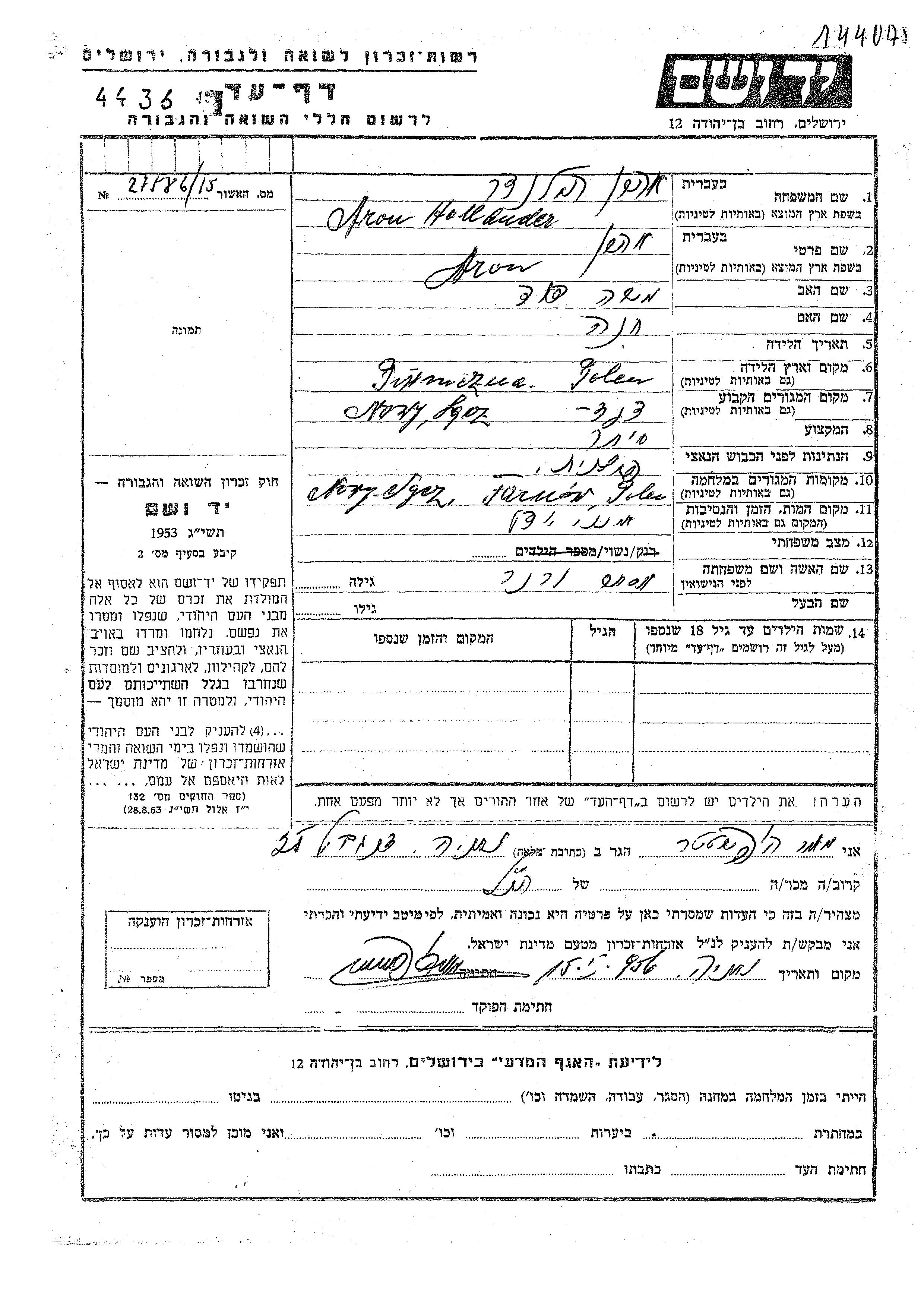 Aron Hollander was born in Piwniczna, Poland to David Moshe and Khana. He was a merchant and married to Ester nee Verner. Prior to WWII he lived in Nowy Sącz, Poland. During the war he was in Nowy Sącz, Poland. Aron was murdered in the Shoah.