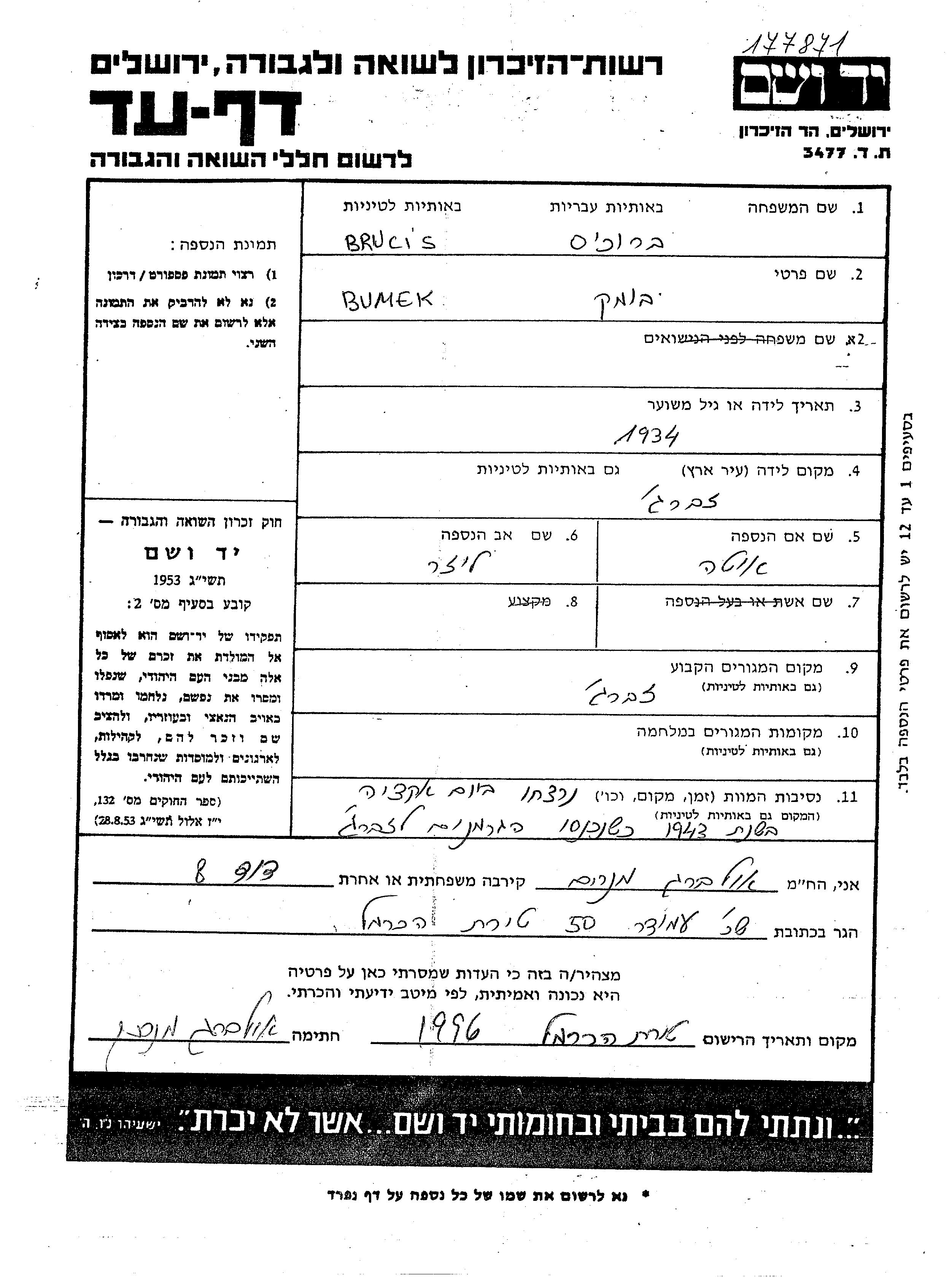 Brucis Bumek 1934 Zbaraż, Poland Page of Testimony