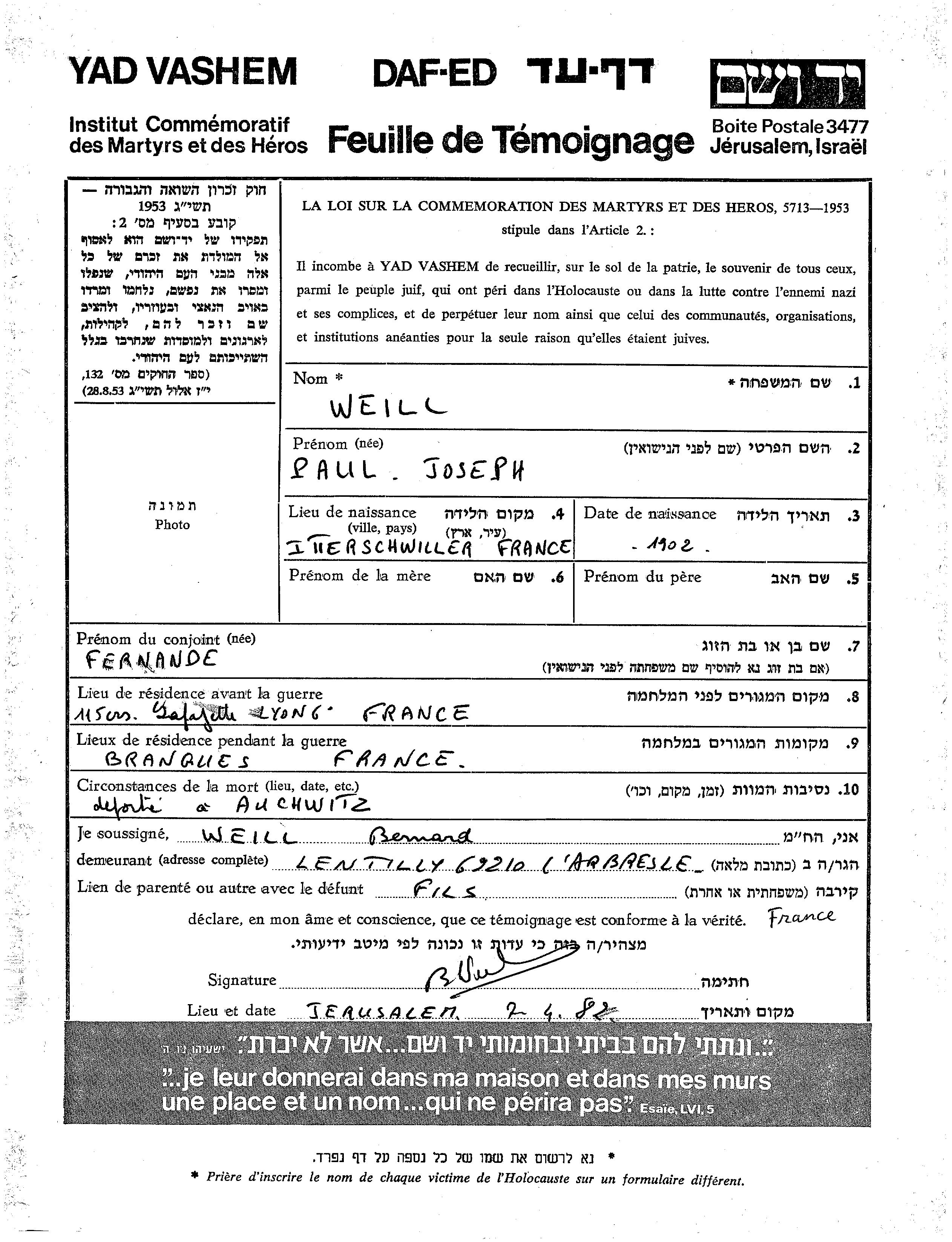 Paul Joseph Weill was born in Itterswiller, France, 1902. He was married to Fernande. Prior to WWII he lived in Lyon, France. During the war he was in Brangues, France. Paul Joseph was murdered in the Shoah. Place of death: Auschwitz, Poland.