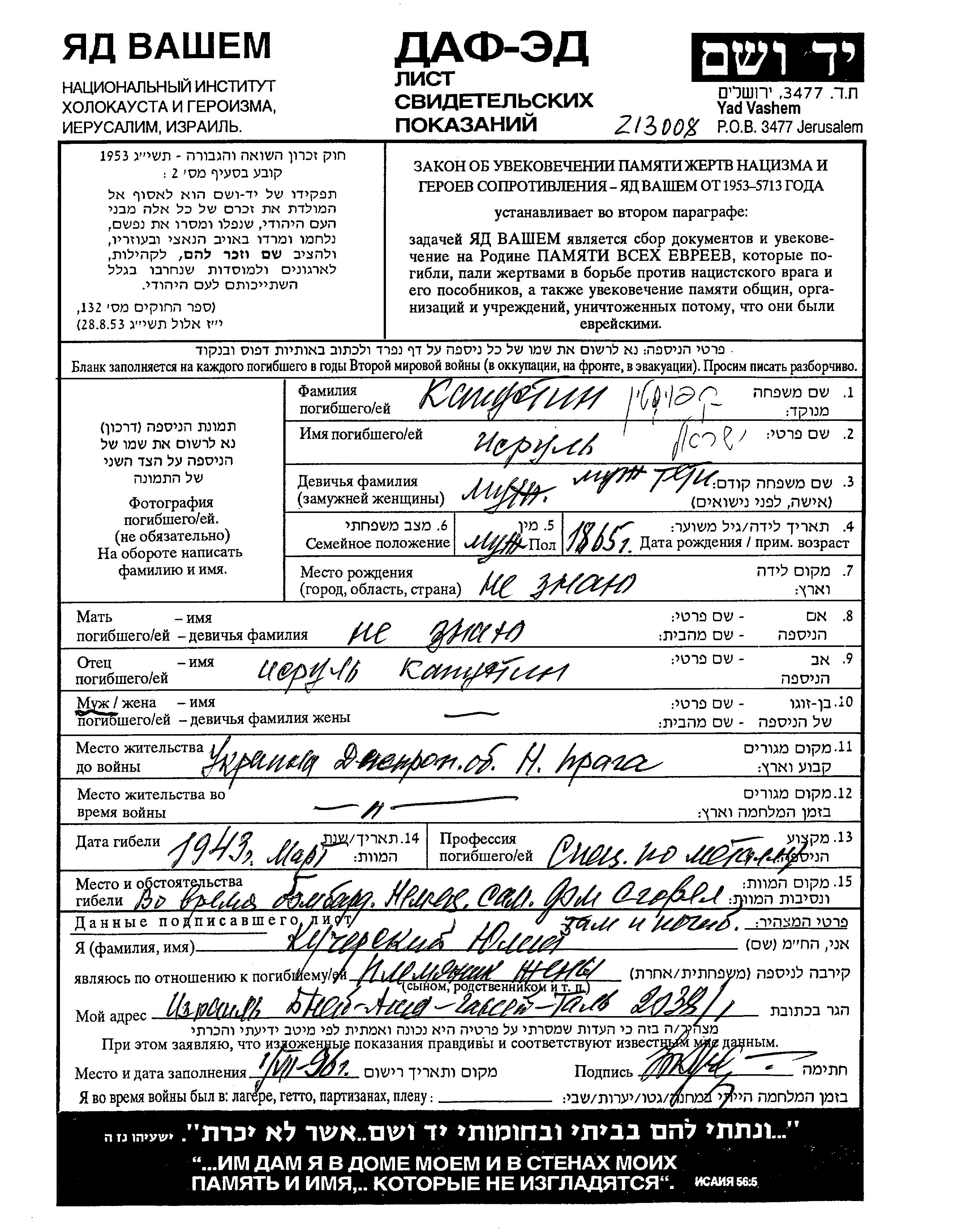 Isrul Kapustin was born, 1865. He was a worker and married to Golda. Prior to WWII he lived in Novaya Praga, Ukraine (USSR). During the war he was in Novaya Praga, Ukraine (USSR). Isrul was murdered in the Shoah. Place of death: Novaya Praga, Ukraine (USSR), 1943.