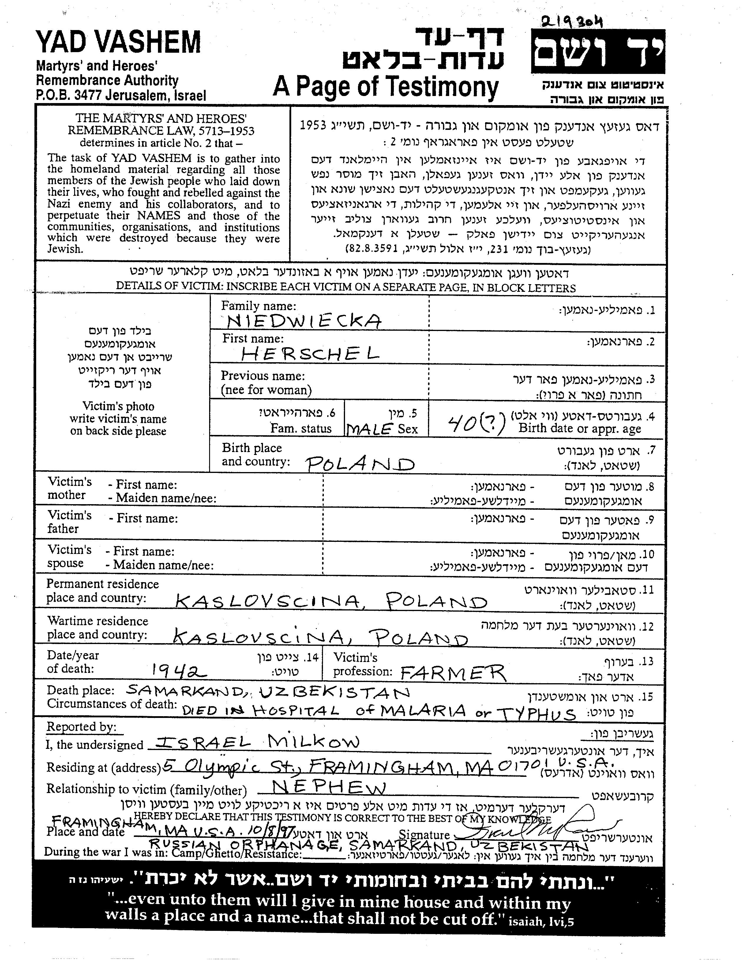 Herschel Niedwiecki was born in Poland, 1902. He was an agriculturist. Prior to WWII he lived in Kozlowszczyzna, Poland. During the war he was in Poland. Herschel was registered following the evacuation/ in the interior of the Soviet Union.
